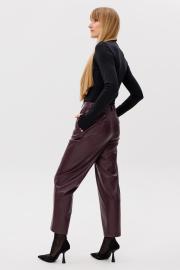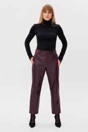 Брюки женские прямого кроя,чуть заужены к низу, длина до щиколотки. Выполнены в коже, в трендовом цвете баклажан. Спереди есть боковые карманы.