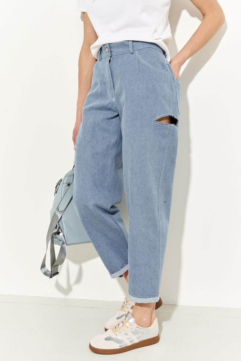 Стильные женские джинсы выполнены из натуральной хлопковой ткани классического голубого цвета, прилегающие в области талии, зауженные к низу; по переду и спинке функциональные карманы; по боковому шву декоративный разрез с необработанным срезом. Застежка на молнию, петлю и пуговицу. Джинсы полностью соответсвует заявленному размеру. Пожалуйста, пользуйтесь таблицей замеров готового изделия, чтобы подобрать идеальный размер.