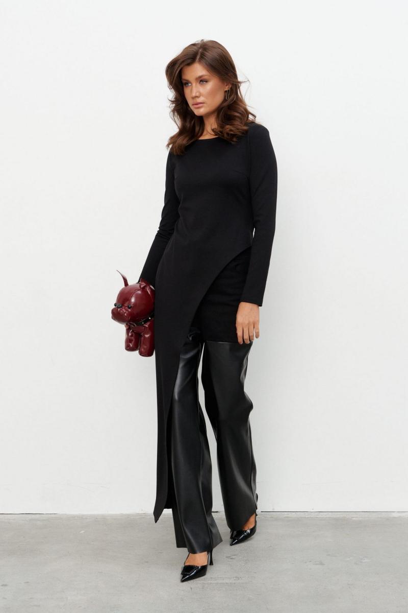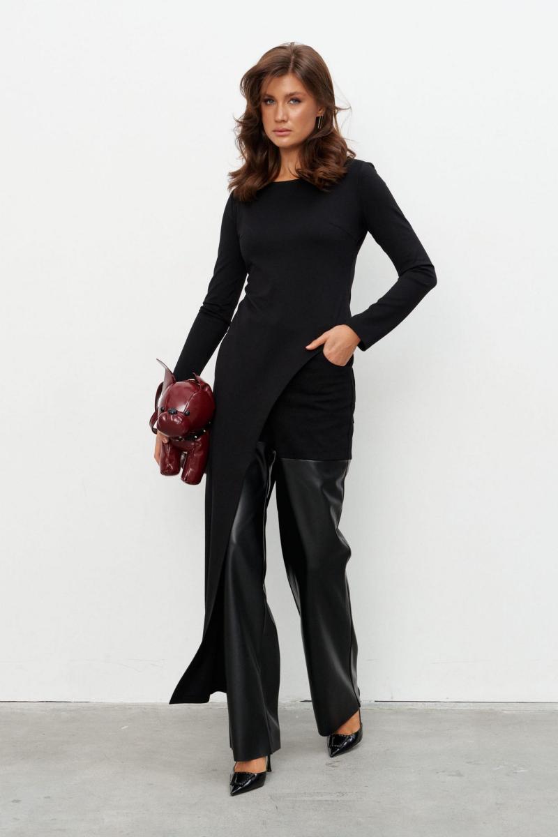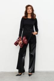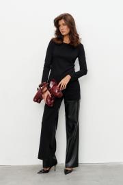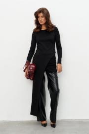 Брюки прямого силуэта выполнены на сочетании плотного джинса и экокожи. Брюки на поясе со шлёвками и застежкой на металлические пуговицы-болты. По переду два прорезных кармана, по спинке - два накладных. Длина брюк от талии 44-48р - 109 см 50-54р - 110,5 см