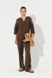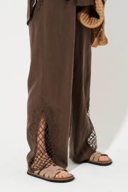 Брюки женские из смесовой ткани с добавлением льна. Брюки прямого силуэта. Верхний срез брюк обработан притачным поясом со вставкой на резинке в задней и боковой части брюк. В боковом шве имеются потайные карманы. Брюки имеют по низу изделия дизайнерскую вышивку веревкой, что добавляет им легкость и утонченность. Очень красивые брюки, в котором вы обязательно будете стильно смотреть, а также они обязательно будут радовать вас своим стильным и удобным фасоном.