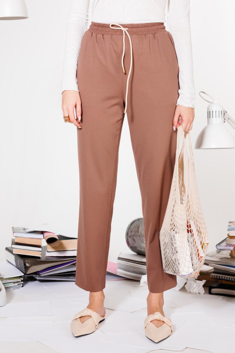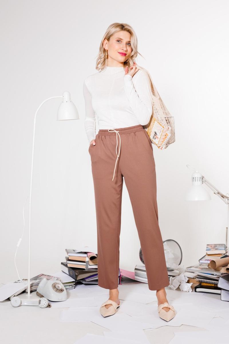 Базовые брюки с посадкой на талии и поясом на резинке, которые визуально вытягивают силуэт, можно носить не только с туниками и толстовкам, но и с рубашками и укороченными моделями. Мы выбрали для них плотную ткань на основе вискозы — такой трикотаж гладкий, ровный и визуально напоминает текстиль. А благодаря добавлению искусственных волокон материал держит форму и отлично дышит.