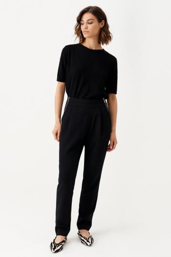 Прямые брюки на резинке - это сдержанность и лаконичность. Золотые дизайнерские пуговицы вдоль линии карманов, пояс сзади на резинке, это красота и удобство в одном флаконе. Это лучшие брюки для любого гардероба. Длина изделия – 100 см