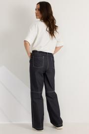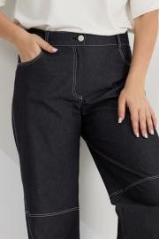 Брюки прямого свободного кроя. Выполнены из джинсового полотна средней плотности. Брюки дополнены декоративными строчками вдоль швов, а также металлическими заклепками. Пояс притачной, по спинке дополнен эластичной тесьмой. Спереди застежка гульфик с молнией и пуговицей. Брюки дополнены боковыми карманами, а также накладными карманами сзади. Длина брюк по боковому шву 107 см.
