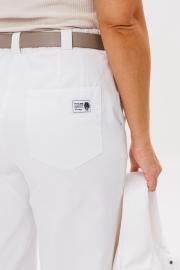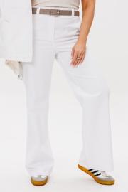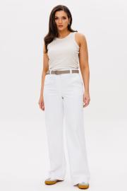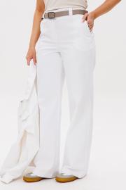 Брюки женские прямые, с высокой посадкой на притачном поясе со шлевками. На спинке в пояс вставлена резинка. Застежка на молнию с гульфиком и откоском. Брюки из тонкого джинса.