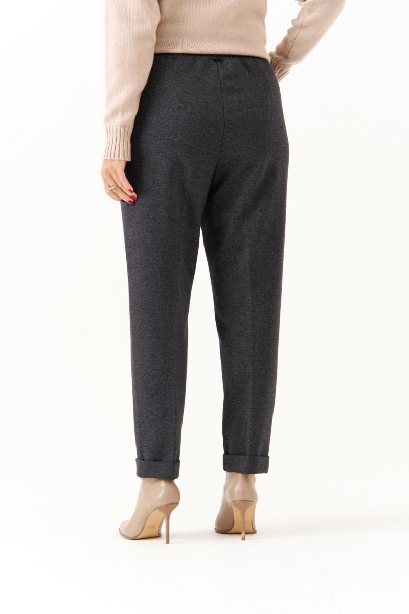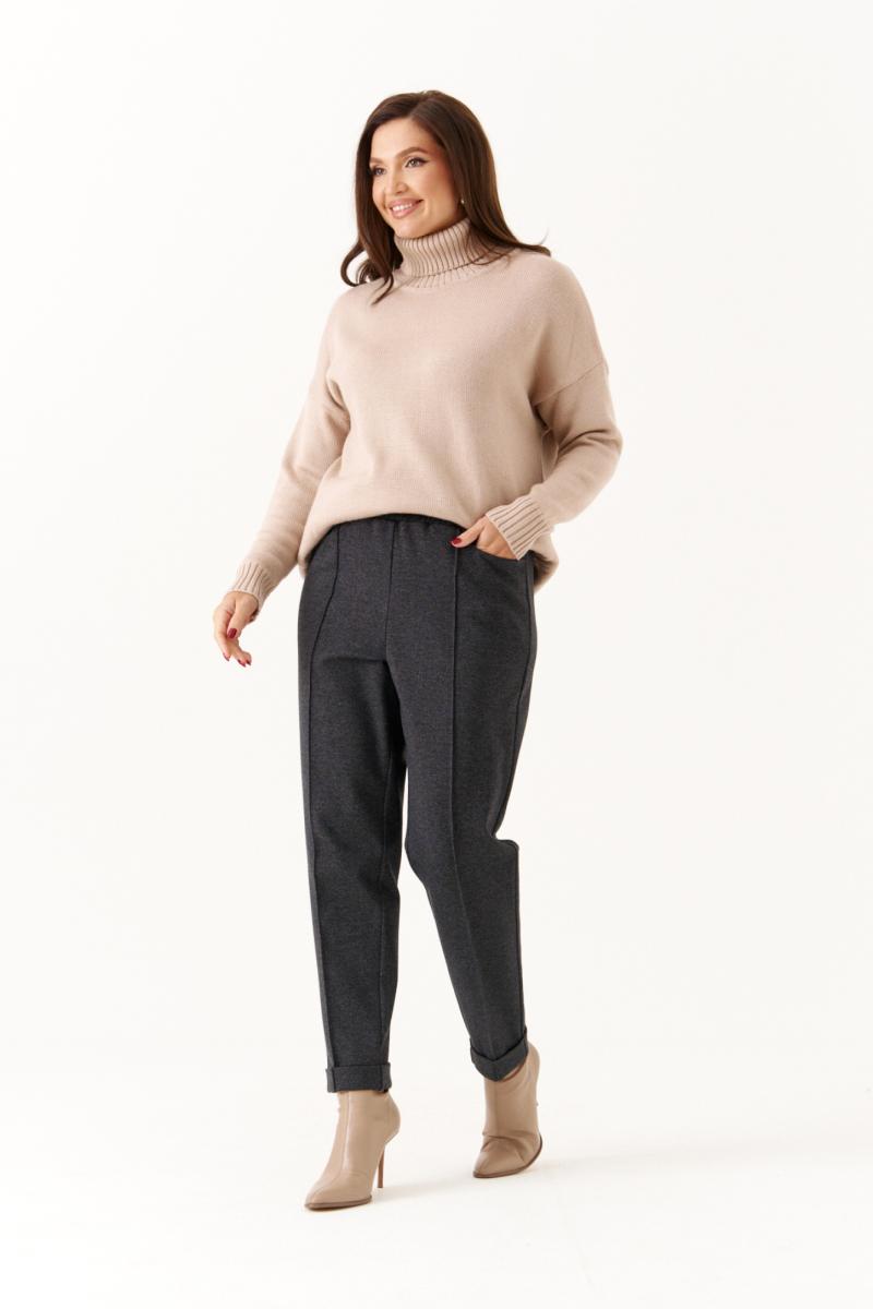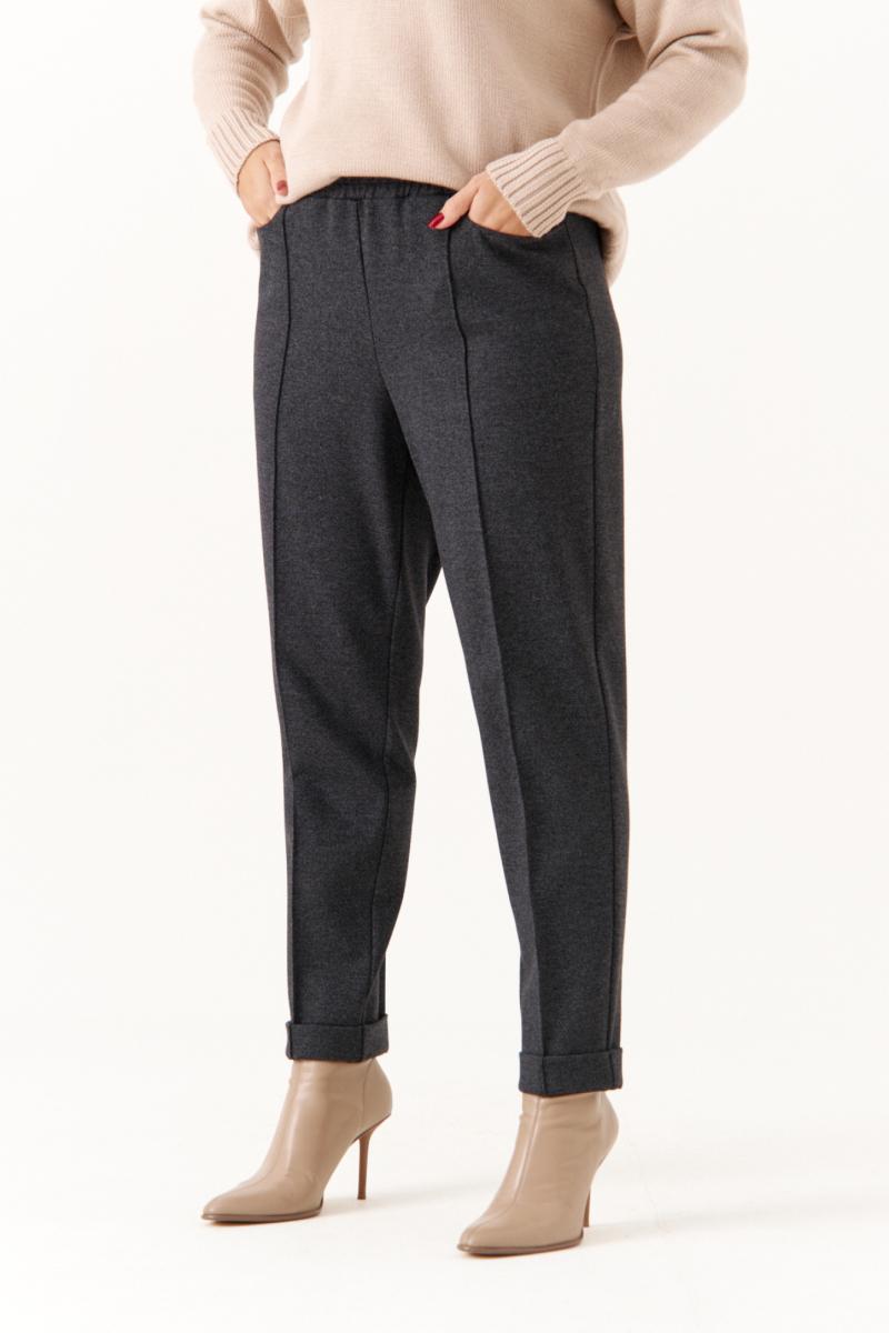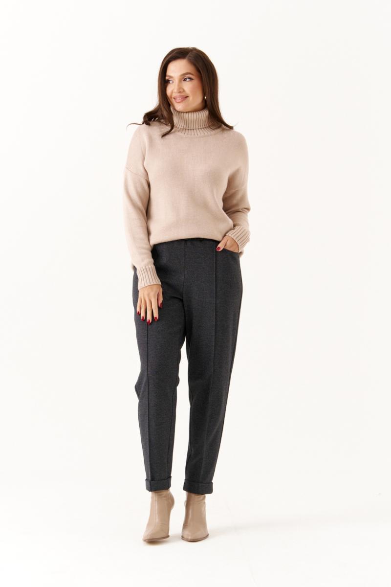 Женские брюки из смесового трикотажного полотна темно-серого цвета, идеально подходящие для повседневной носки. Модель заужена к низу и оснащена притачным поясом с эластичной вставкой для комфортной посадки. Передняя часть украшена аккуратной застроченной стрелкой. Брюки имеют удобные карманы с подкройным бочком и завершены манжетами внизу, что придаёт образу стиль и аккуратность.