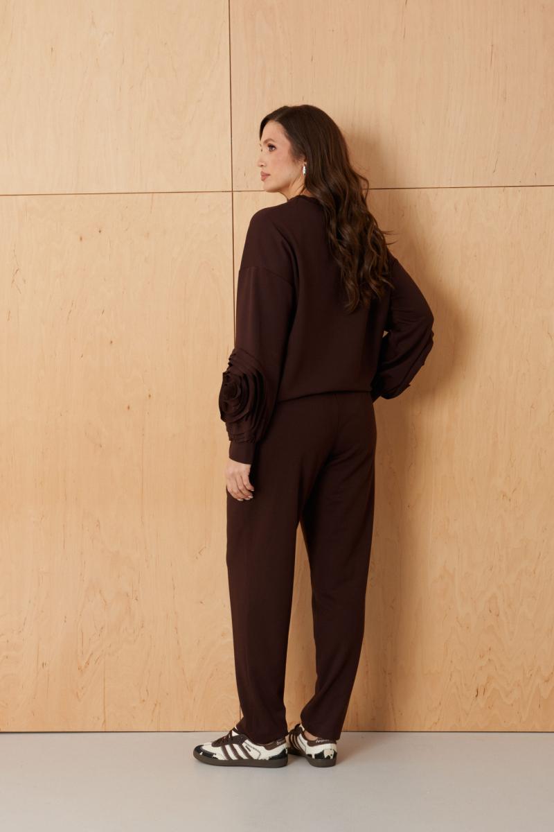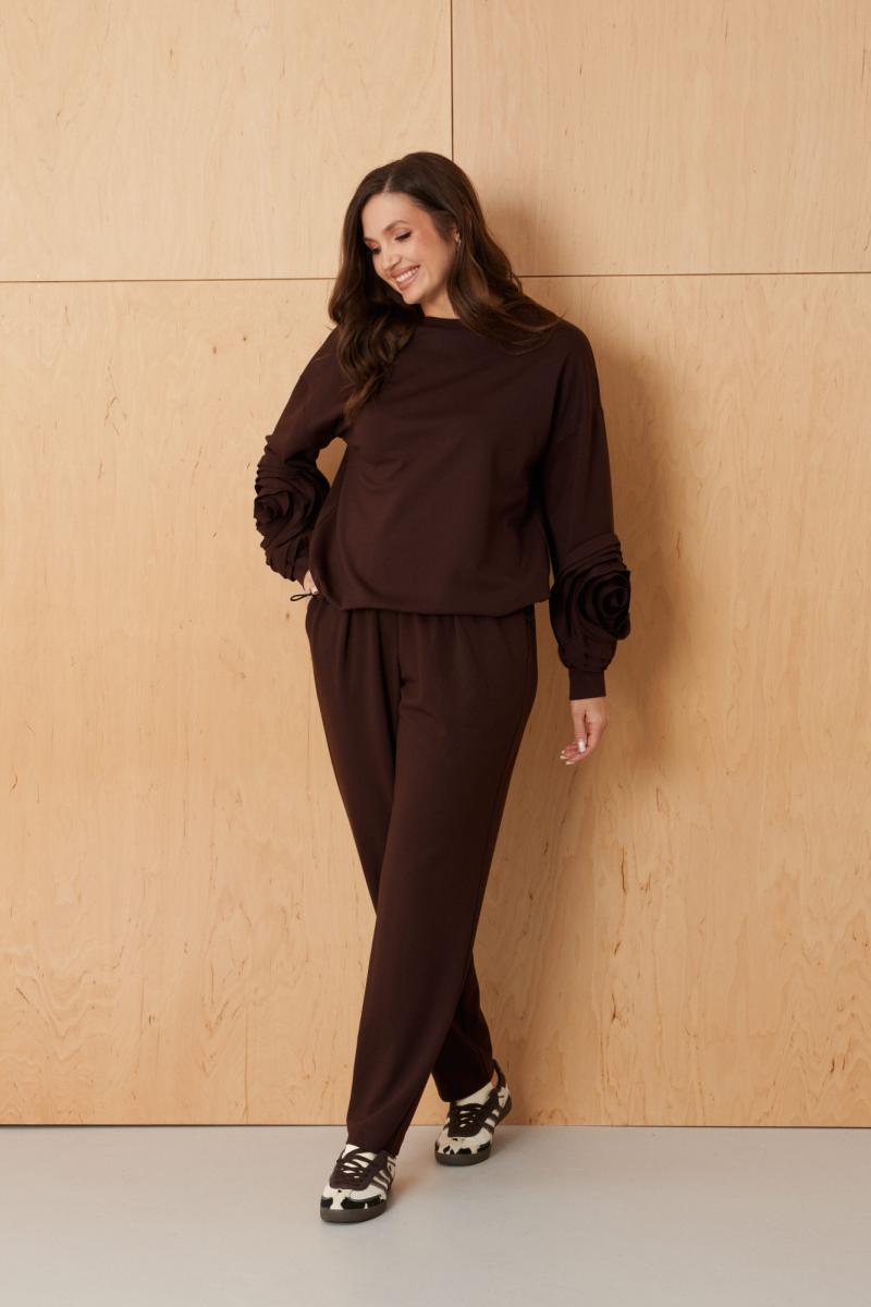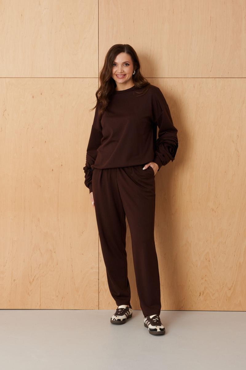 Эти женские брюки выполнены из смесового трикотажного полотна и предназначены для повседневной носки. Модель прямого кроя обеспечивает комфорт и универсальность. Верхний срез брюк обработан притачным поясом на резинке, что позволяет идеально прилегать к любой фигуре и регулировать посадку. Брюки имеют имитацию застежки, создавая аккуратный и стильный внешний вид. Передняя часть украшена складкой, добавляющей изящества и легкости образу. В боковом шве расположен потайной карман с подкройным бочком, обеспечивающий практичность и удобство. Модный шоколадный оттенок придает брюкам яркий и насыщенный вид, делая их привлекательным элементом гардероба. Эти брюки отлично подчеркнут вашу индивидуальность и будут привлекать восхищенные взгляды.