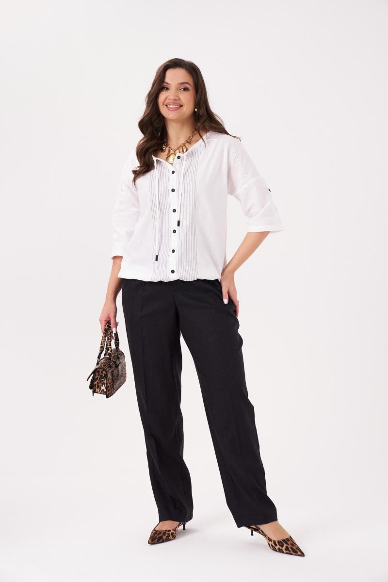 Брюки женские прямые из смесовой ткани для повседневной носки. Верхний срез брюк обработан притачным поясом, застежка на одну петлю и одну пуговицу, а также имеется застежка на тесьму-молнию в среднем шве брюк. Задняя часть брюк имеет вытачки, входящие в прорезной карман в рамку с двумя обтачками. В брюках расположен в боковом шве карман с подкройным бочком и с небольшими разрезами к низу изделия. Отличный классический вариант брюк, которые будут гармонично смотреться под любые изделия.