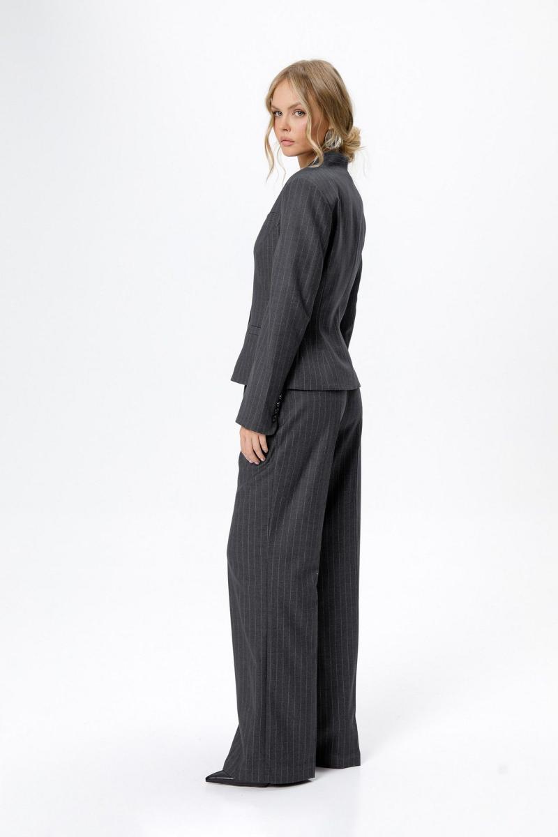 Широкие прямые брюки с полоску. Детали: брюки с притачным поясом со шлевками, передние половины с небольшими застроченными мягкими складками и заутюженными стрелками, застежка на молнию и пуговицу, боковые карманы. Задние части брюк с вытачками и заутюженными стрелками. Пояс брюк прямой, без резинки. Длина брюк по боковому шву с поясом около 114 см в размерах 40-46 и около 115,5 см в размерах 48-52. Длина по внутреннему шву около 83 см