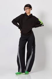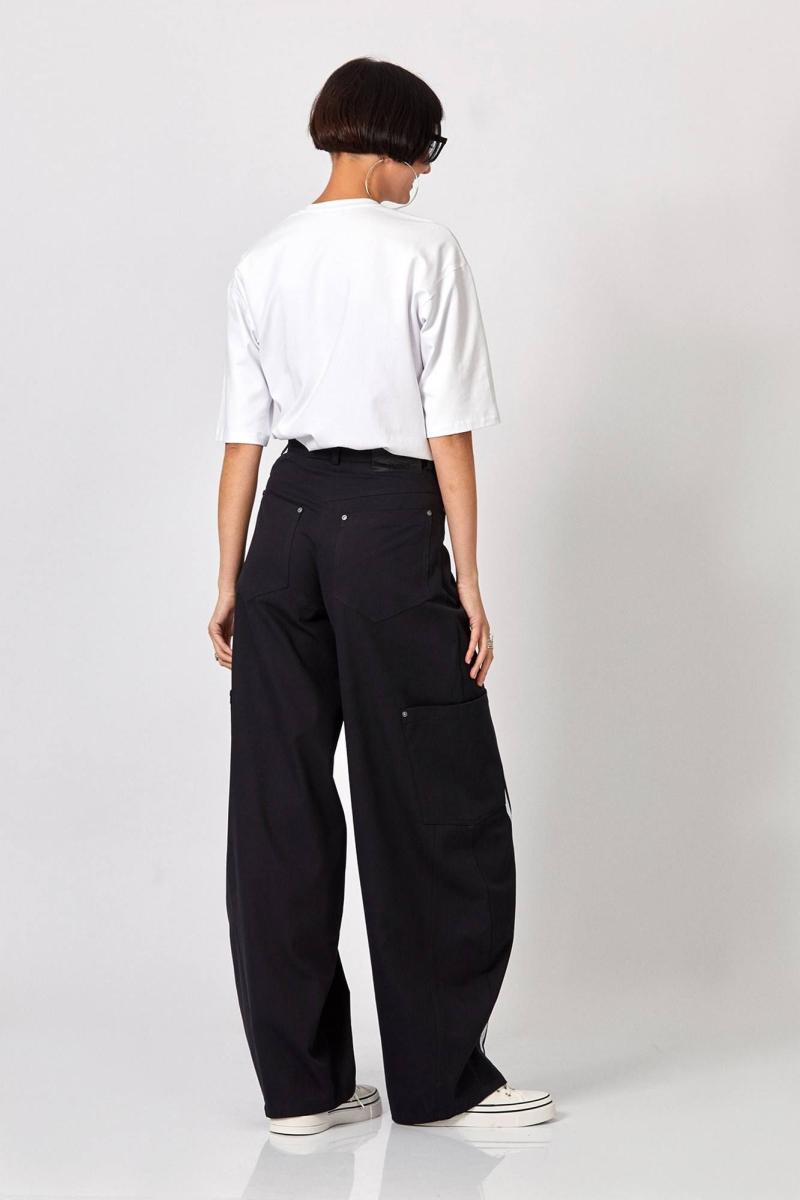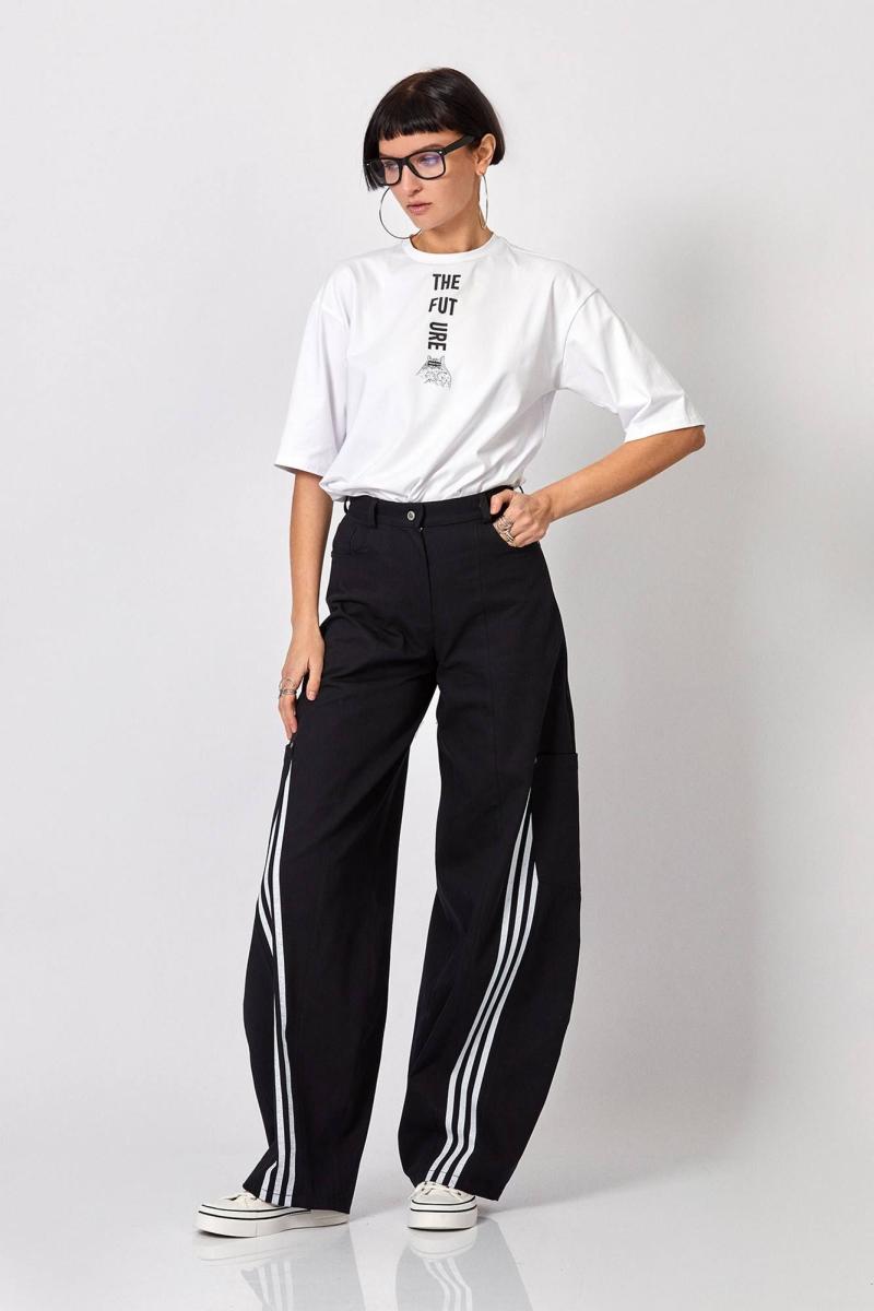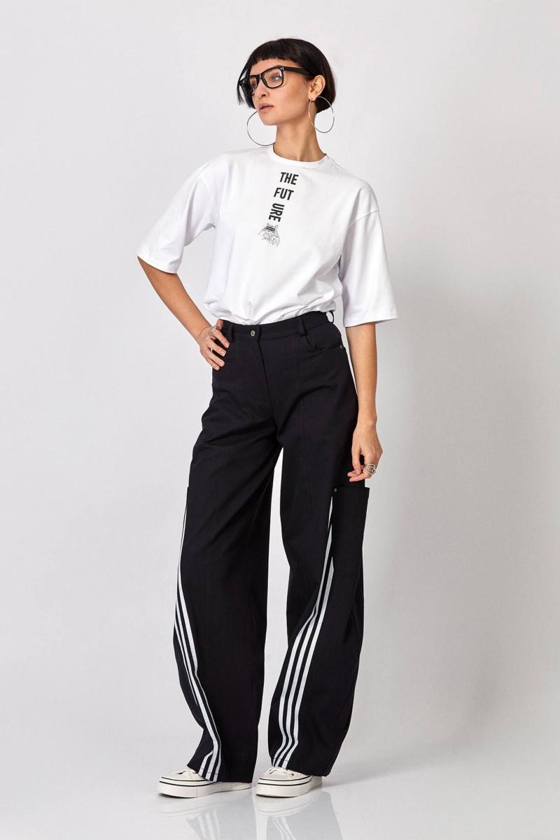 Брюки из тонкого джинса: - силуэт расширенный книзу, форма штанины ""банан"" - прямой пояс с пятью шлёвками и застёжкой на кнопку - декоративные членения спереди и сзади, отделаны одинарными и двойными строчками - спереди тройные лампасы - сзади кокетка и фигурные накладные карманы