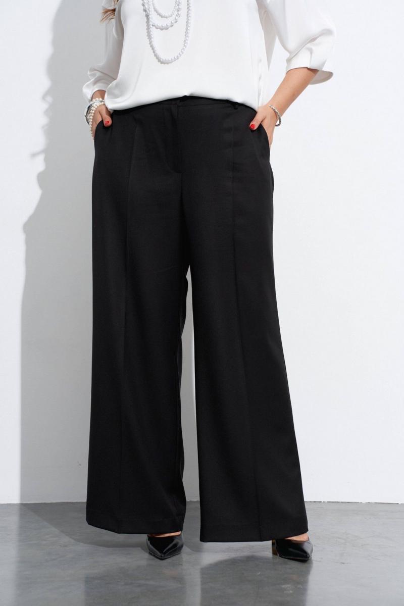 Широкие прямые брюки с фигурными входами карманов, застежкой на молнию спереди и с притачным поясом на эластичной тесьме, со шлёвками. Длина сбоку с поясом ок. 106 см., по внутреннему шву ок. 79 см.