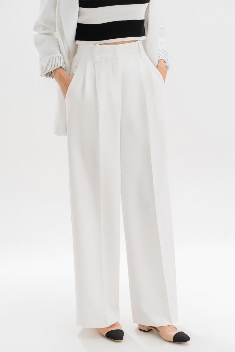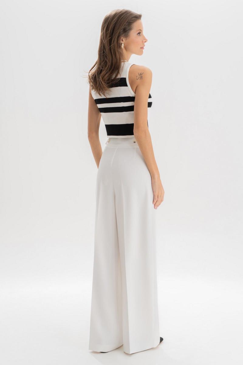Эта модель рассчитана на девушек с ростом 176–182 см, позволяя создать элегантный, вытянутый силуэт. Идеальные белые брюки — основа капсульного гардероба. Модель выполнена в прямом крое, визуально вытягивающем силуэт и придающем образу легкость. Аккуратные стрелки, лаконичные складки от пояса и деликатные вытачки формируют безупречную посадку. Пояс с регулируемыми патами обеспечивает комфортную посадку на талии, а универсальный цвет легко сочетается как с базовыми топами, так и с яркими акцентами. Брюки женские, прямые, выполнены из костюмно-плательной ткани. Передние и частично задние половинки брюк, с отрезным поясом, задние половинки брюк от вытачки до бокового шва с цельнокроеным поясом, с застёжкой на тесьму - «молнию», расположенную в среднем шве передних половинок. Пояс застегивается спереди на один пришивной крючок и 1 петлю и 1 потайную пуговицу. Для регулировки пояса по талии в боковых швах обработаны паты, застегивающиеся на 1 петлю и 2 пуговицы. Передние половинки брюк с боковыми наклонными карманами, частично застроченными от пояса вниз на 3,0 см, с двумя парами односторонних складок от пояса, и 2-мя шлевками. Задние половинки брюк с талиевыми вытачками. Передние и задние половинки брюк с заутюженными стрелками. Состав ткани: полиэстер - 80%, вискоза - 11%, спандекс - 9%.