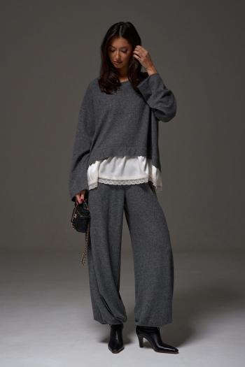 Оригинальный комплект, состоящий из джемпера и брюк с практичной обувью, широко распространен.