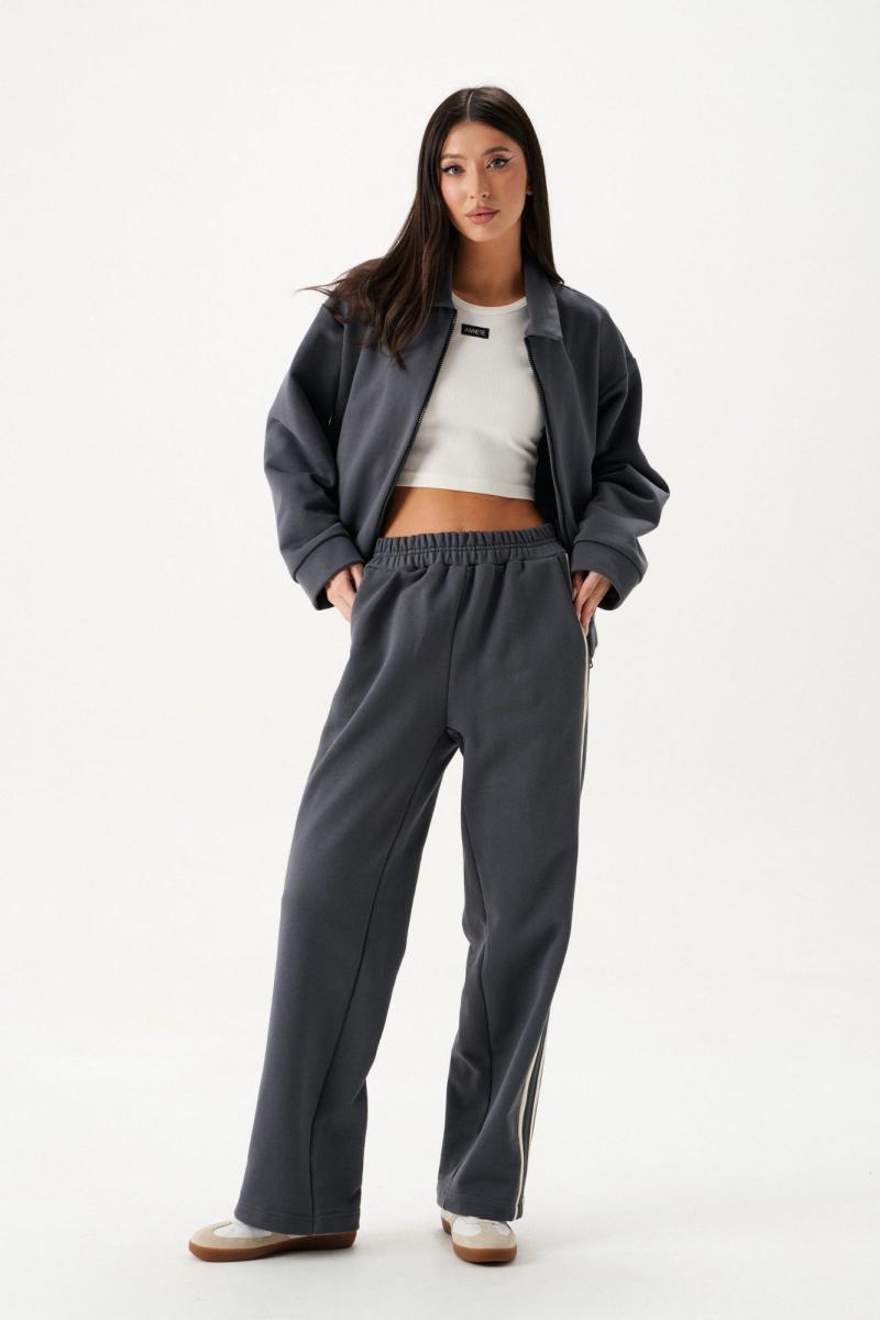 Джемпер цвета графит, выполнен из футера трёхнитки. По переду застёжка молния, воротник отложной, манжеты на рукавах и резинка по низу издедия выполнены из основной ткани. По переду изделия карманы с клапаном. Длина по спинке 54,5 см.