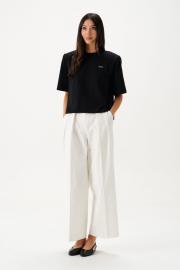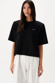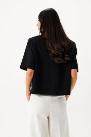 Джемпер прямого свободного кроя с акцентными плечами выполнен из хлопкового полотна черного цвета. Характеристики: прямой крой, подплечники, овальный вырез горловины, по переду брендированная нашивка, рукав втачной. Длина по спинке 51 см, длина рукава 28 см.