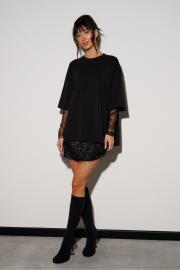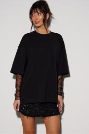Футболка прямого свободного кроя, выполнена из кулирки полотна черного цвета. Характеристика: прямой крой, овальная горловина, спущенный укав, в плечевой шо с внутренней стороны пришты зауженные рукава из ажурной ткани, спинка цельнокраеная. Длина спинки 68см, длина рукава от края горловины 76см.