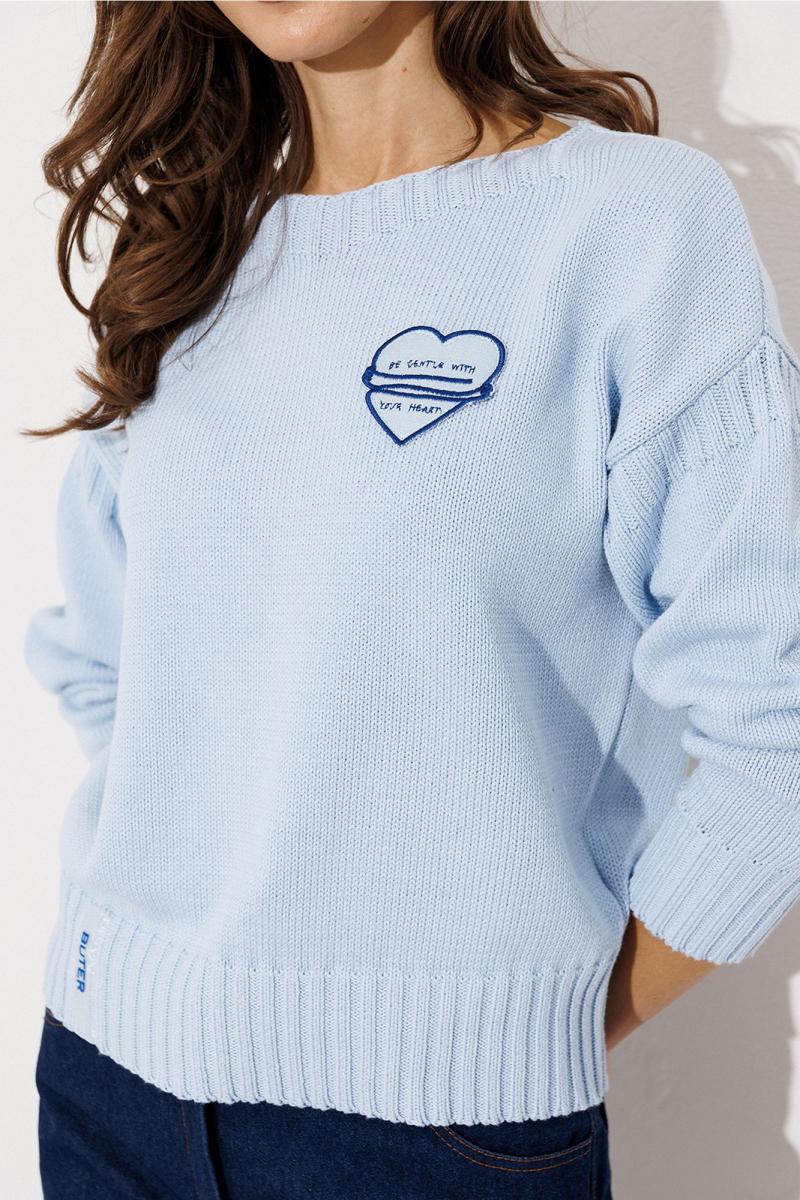 Джемпер трикотажный вязанный с втачным длинным рукавом и спущенной линией плеча. По перу нашивки 'Heart' и нашивка с логотипом «BUTER». Вырез горловины круглый.