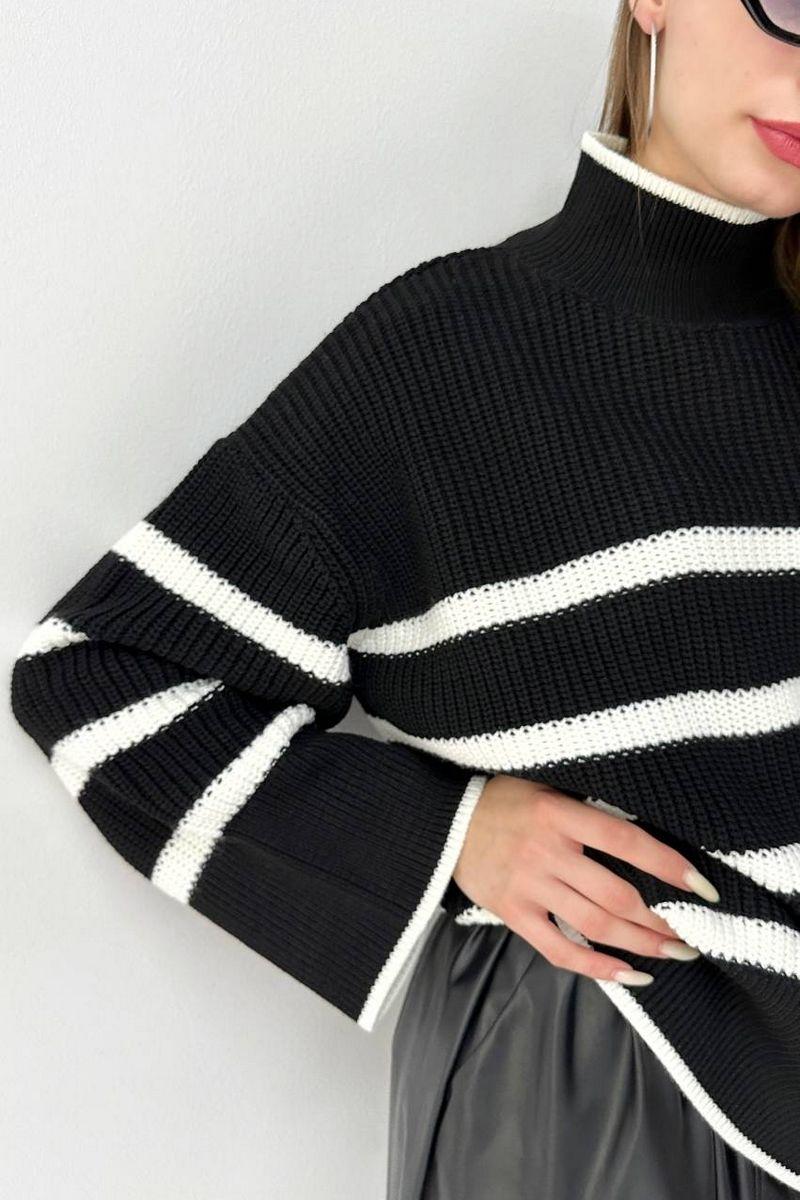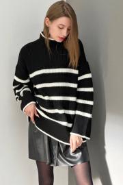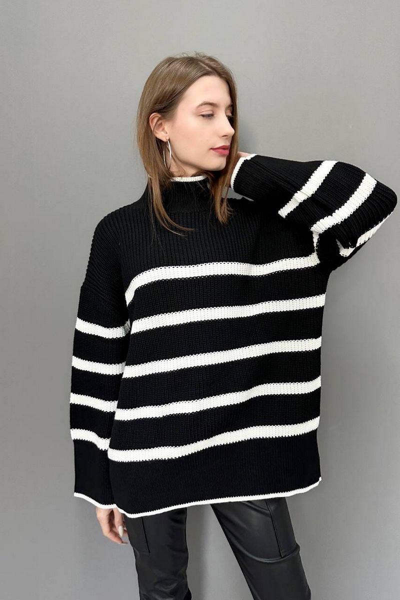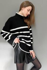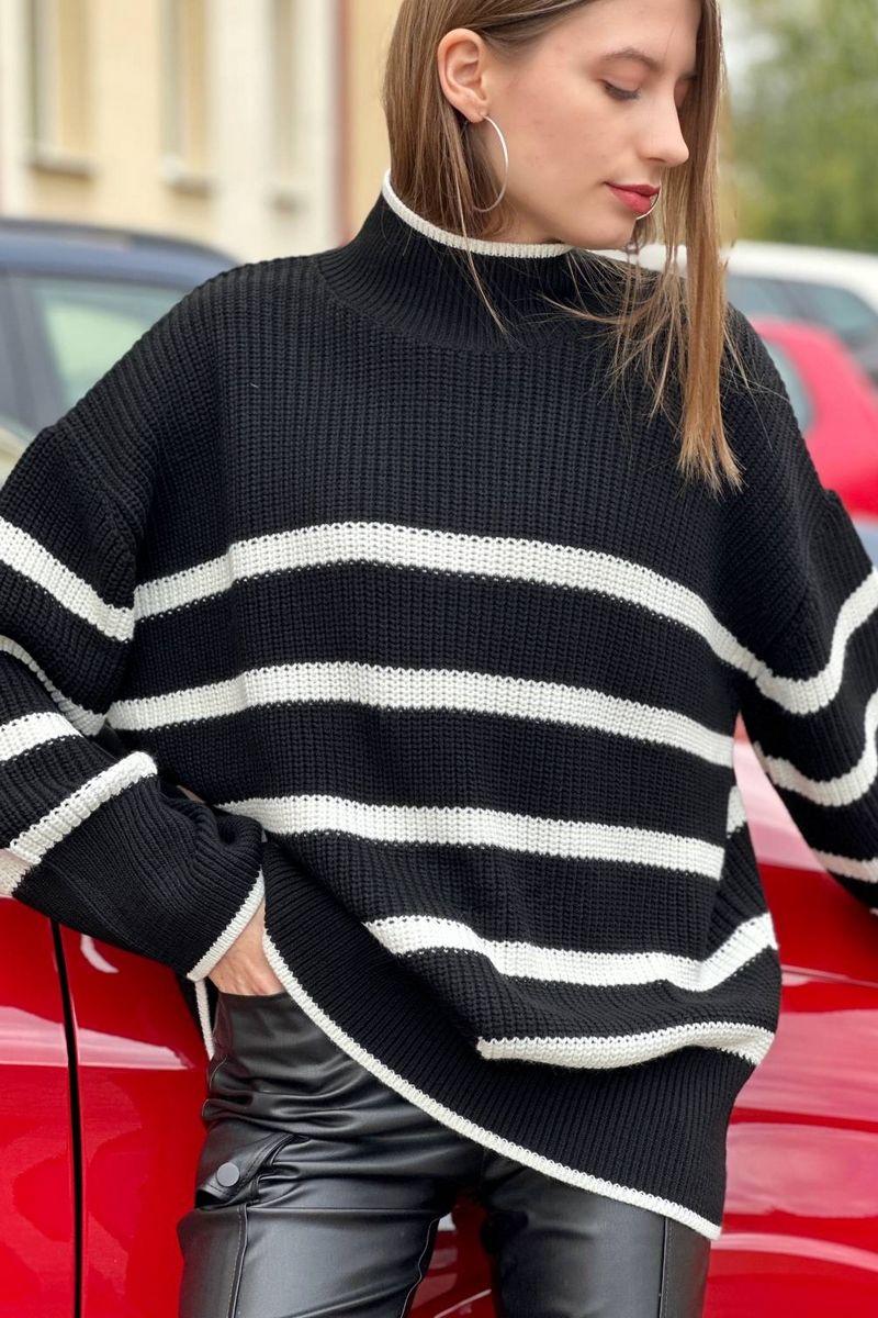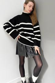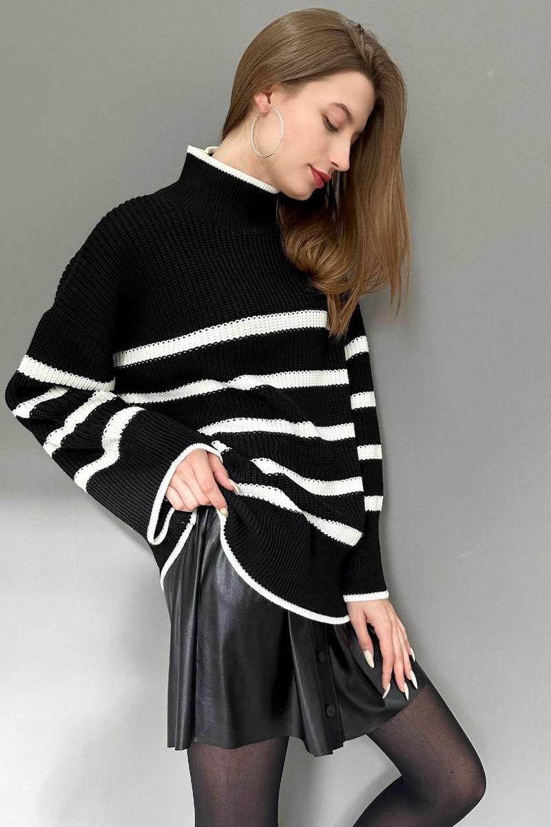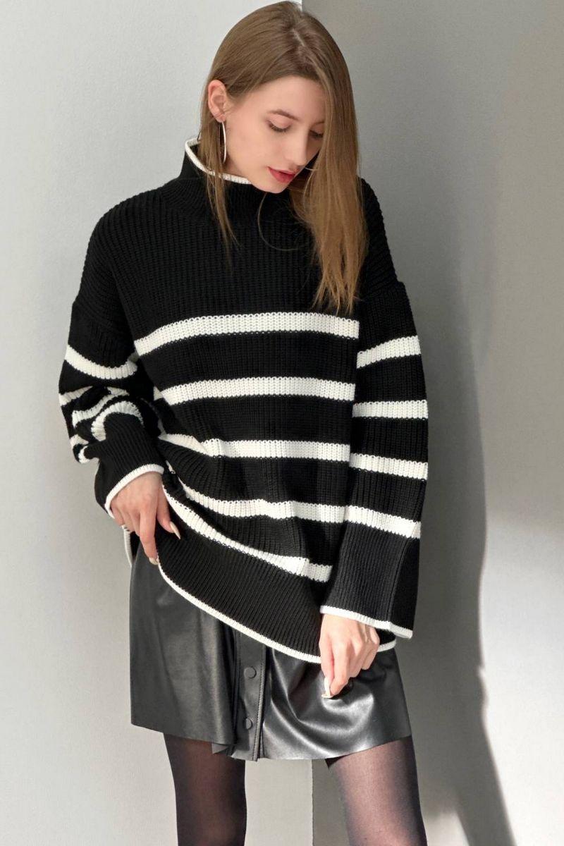 Джемпер из вывязанных деталей, из мягкой объёмной пряжи, прямого силуэта, «оверсайз», длиной до линии бёдер, со спущенной линией плеча, с рукавами длиной до запястья. Горловина округлой формы со стойкой. Низ джемпера, рукавов и стойка горловины более плотной эластичной вязки столбиком.