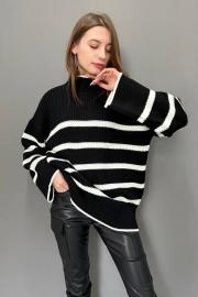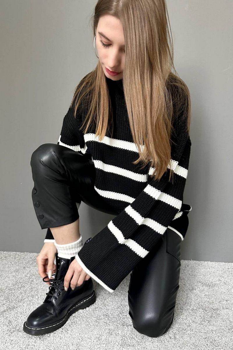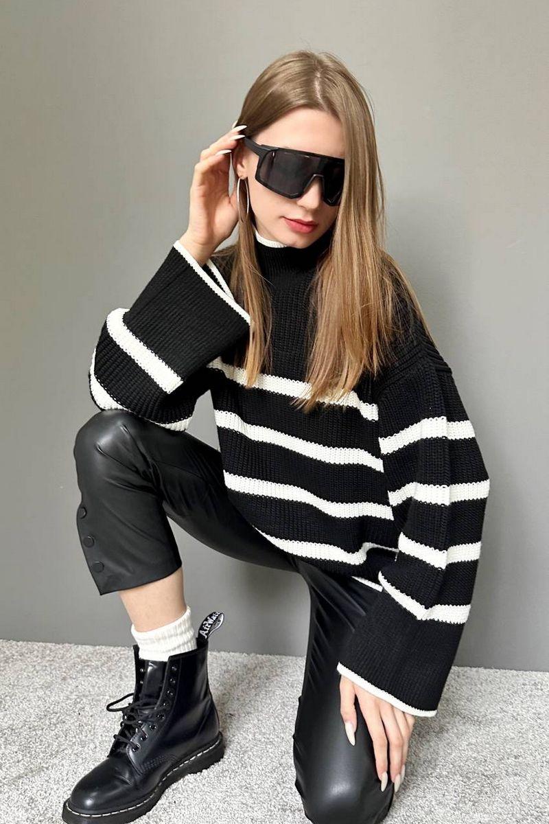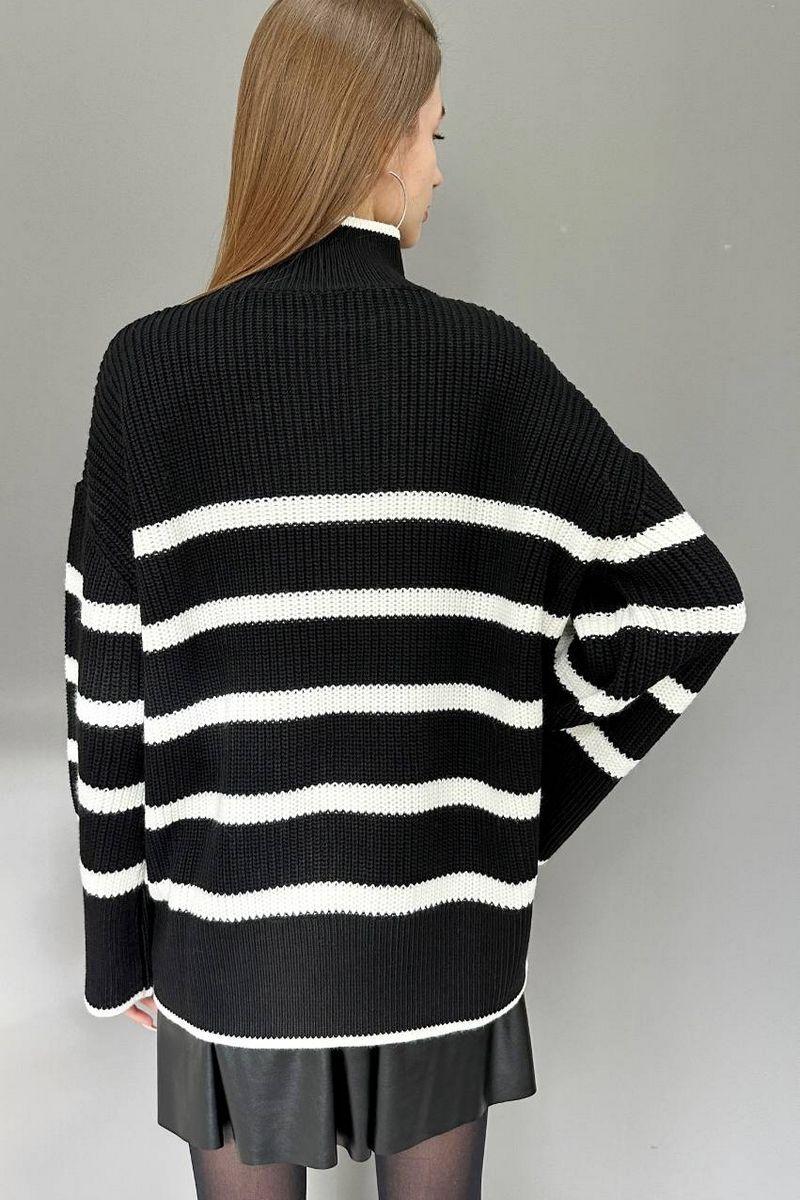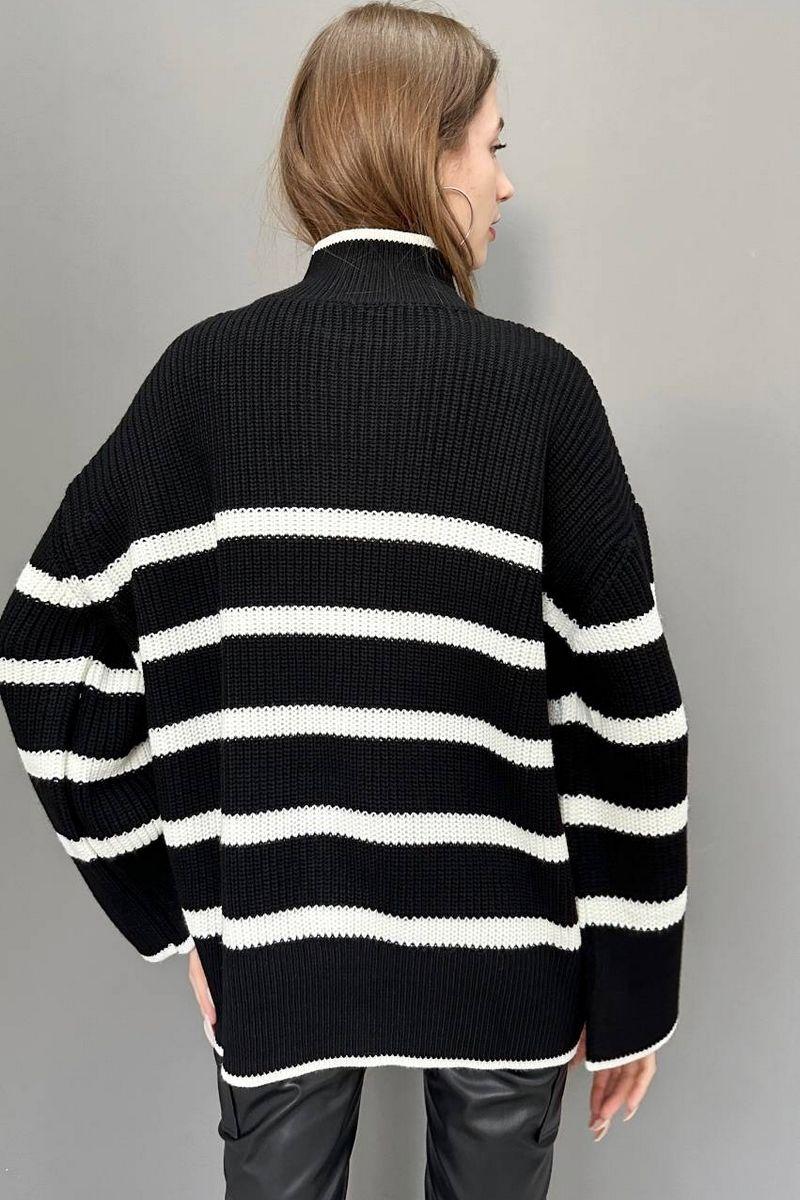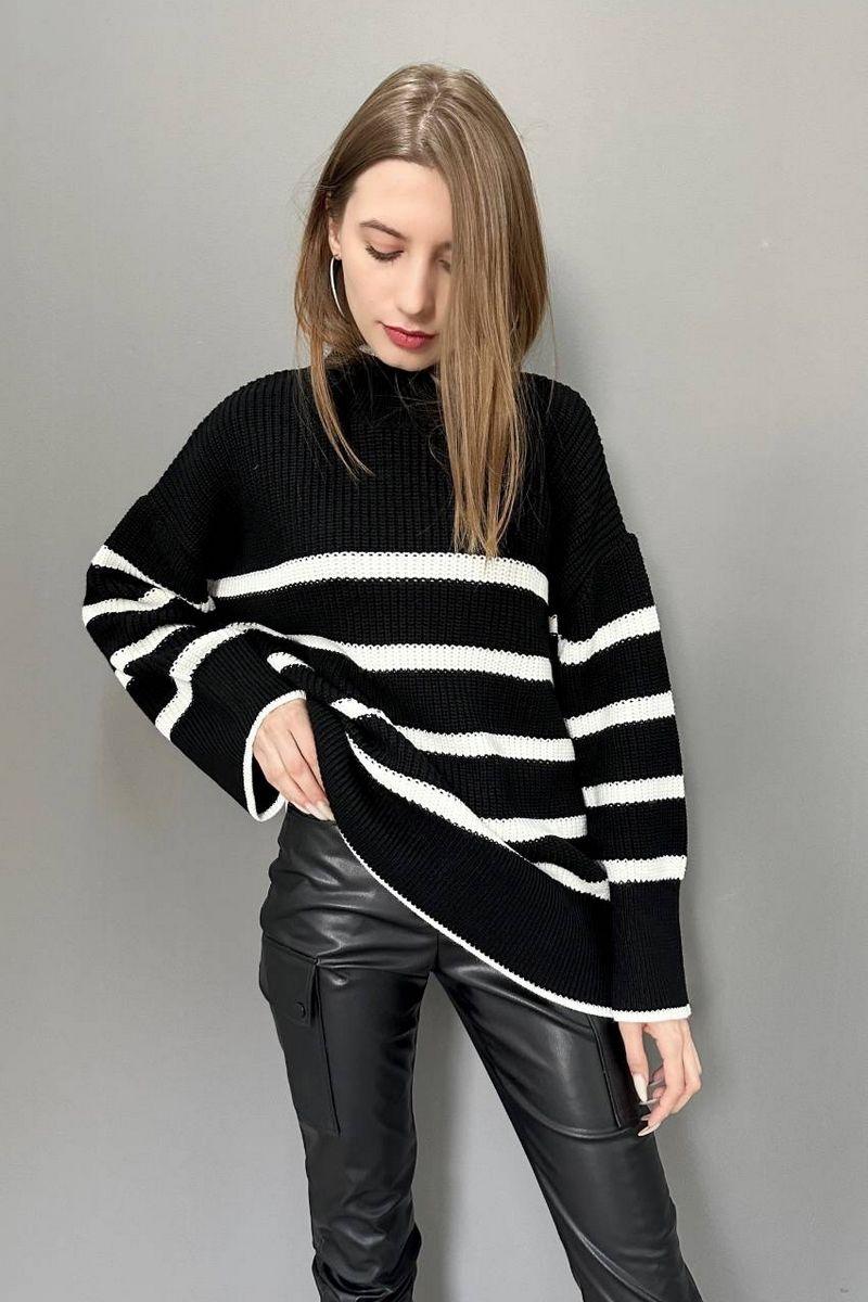 Джемпер из вывязанных деталей, из мягкой объёмной пряжи, прямого силуэта, «оверсайз», длиной до линии бёдер, со спущенной линией плеча, с рукавами длиной до запястья. Горловина округлой формы со стойкой. Низ джемпера, рукавов и стойка горловины более плотной эластичной вязки столбиком.