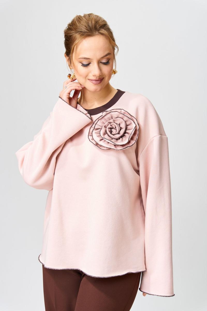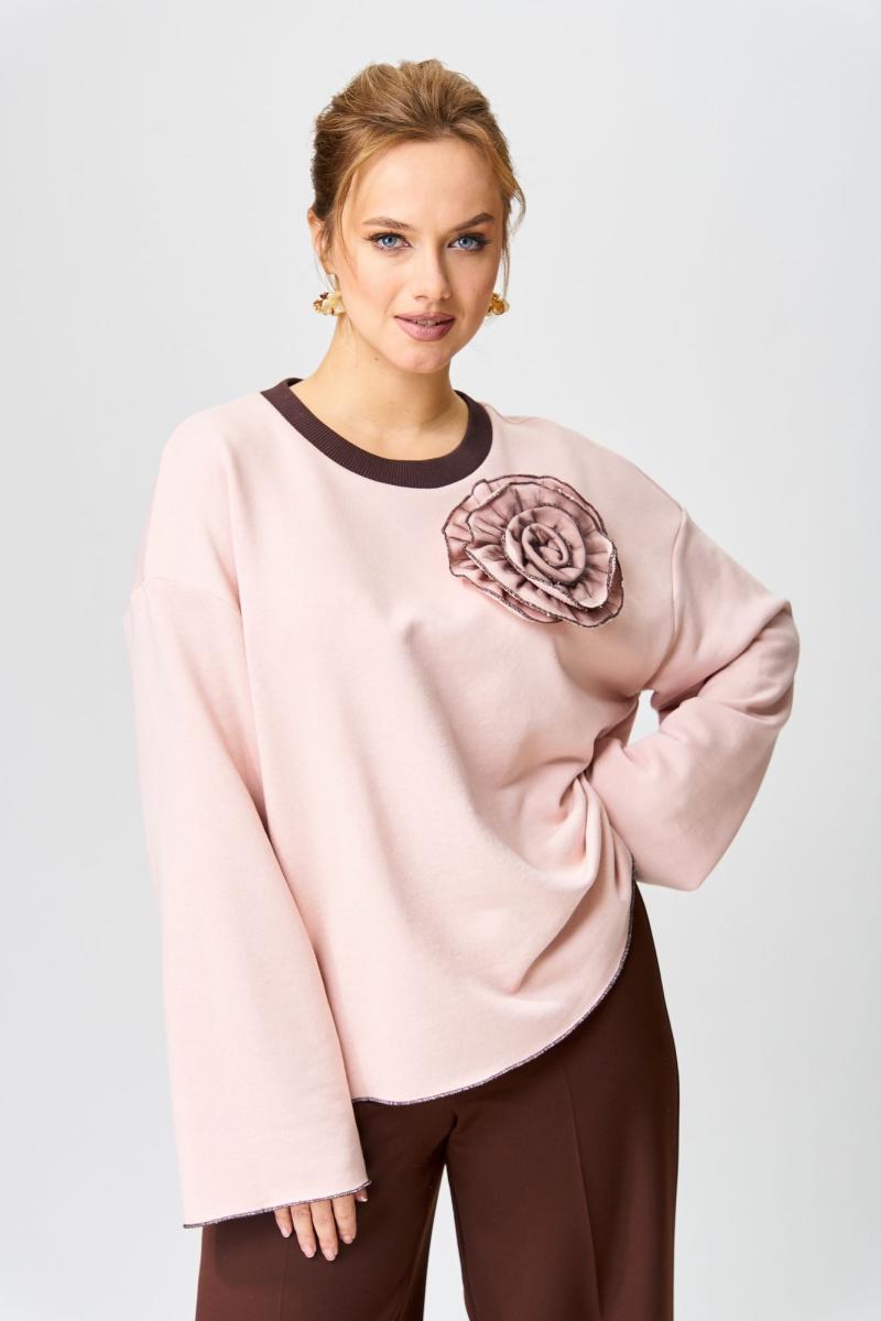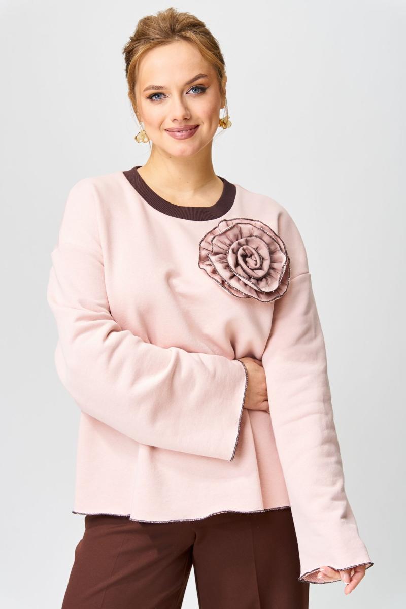 Джемпер свободного силуэта выполнен из трикотажной ткани трехнитки. Горловина округлой формы обработана довязом. Рукав втачной со спущенным плечом. Низ рукава и низ изделия обработаны декоративной строчкой. К джемперу прилагается съемное декоративное украшение цветок. Длина джемпера: 64 см, длина рукава джемпера 54 см.