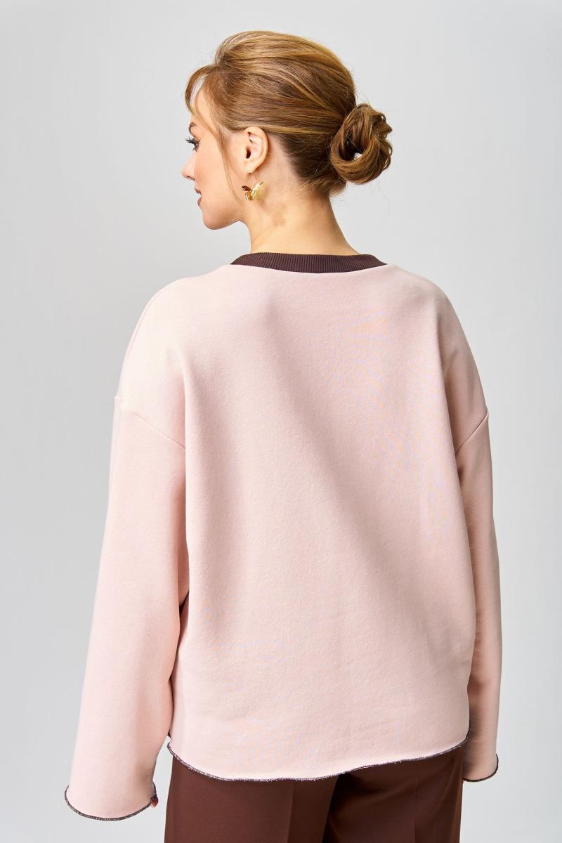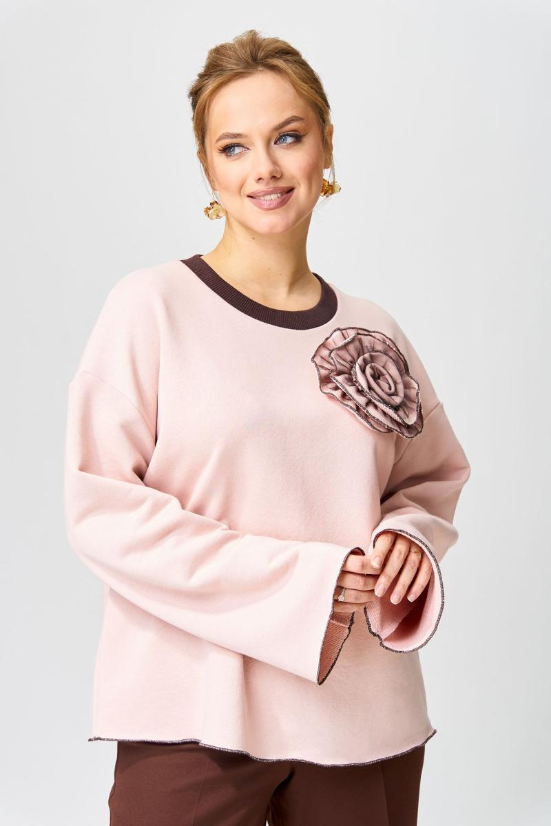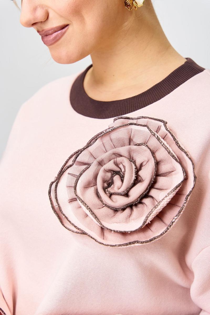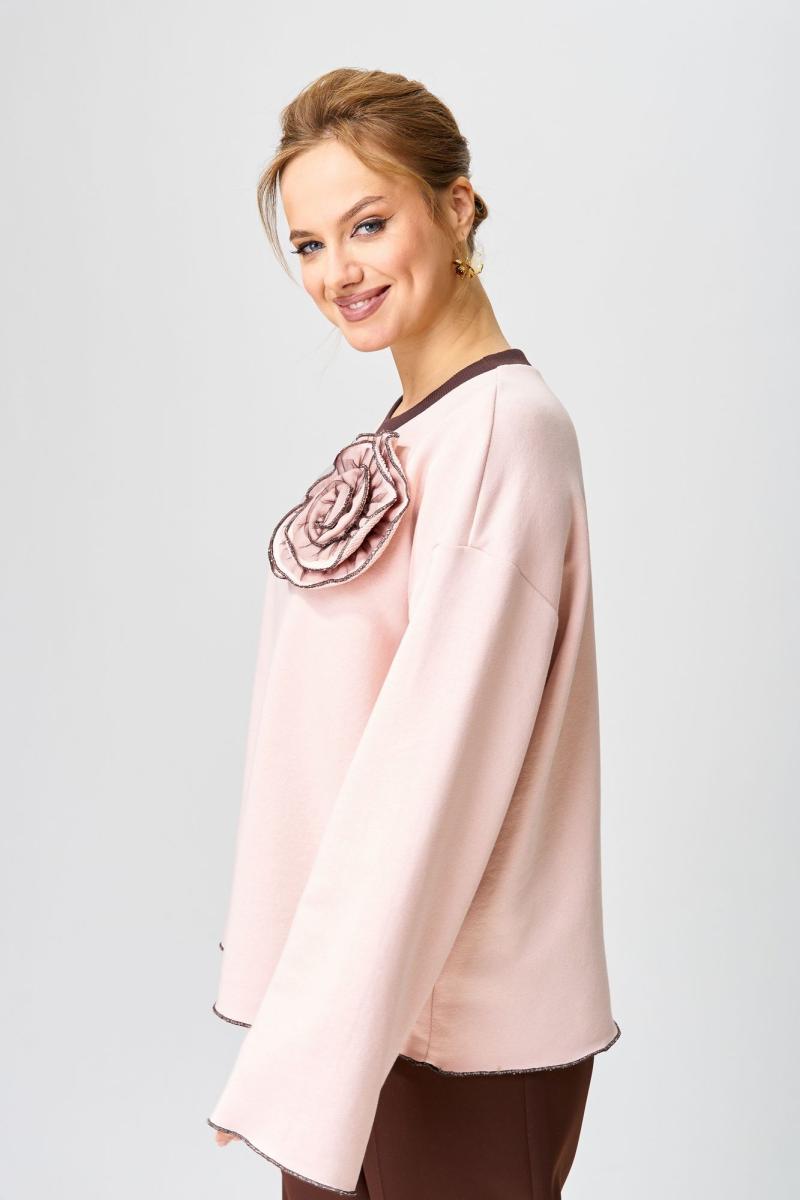 Джемпер свободного силуэта выполнен из трикотажной ткани трехнитки. Горловина округлой формы обработана довязом. Рукав втачной со спущенным плечом. Низ рукава и низ изделия обработаны декоративной строчкой. К джемперу прилагается съемное декоративное украшение цветок. Длина джемпера: 64 см, длина рукава джемпера 54 см.