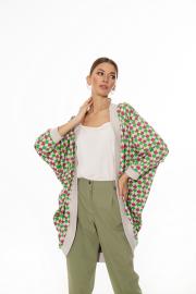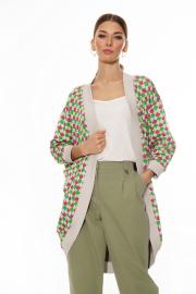 Кардиган женский, из трикотажного полотна,без застежки. Перед разрезной. Спинка цельнокроеная. Линия плеча спущена. Боковой шов оформлен с напуском. Рукав одношовный, по низу обработан притачной манжетой из ткани – компаньона. Горловина, линия борта, низ обработаны притачной манжетой из ткани – компаньона. Длина изделия по спинке 92 см. Длина рукава от горловины 60 см.