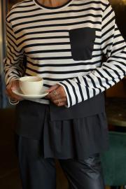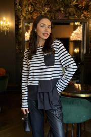 Джемпер женский прямого силуэта. Перед цельнокроеный с нагрудным карманом слева из ткани-компаньона. Спинка цельнокроеная. По низу джемпер обработан баской из ткани-компаньона. Плечо спущено, рукав длинный, одношовный. Горловина округлой формы, обработан притачной бейкой.Цвет материала может отличаться по тону в зависимости от настроек вашего монитора! Длина джемпера по спинке 68,5 см., длина рукава от горловины 78 см.