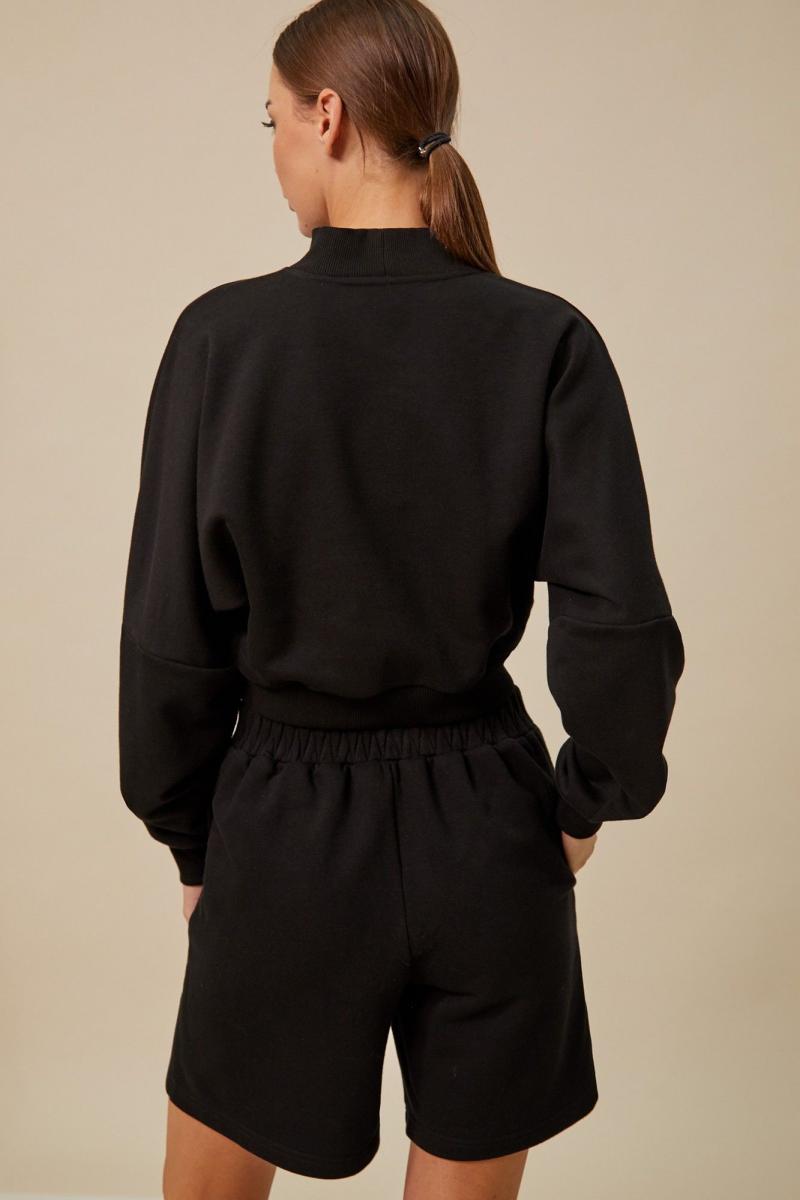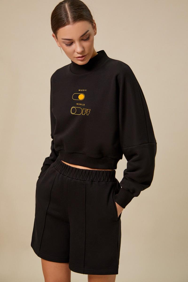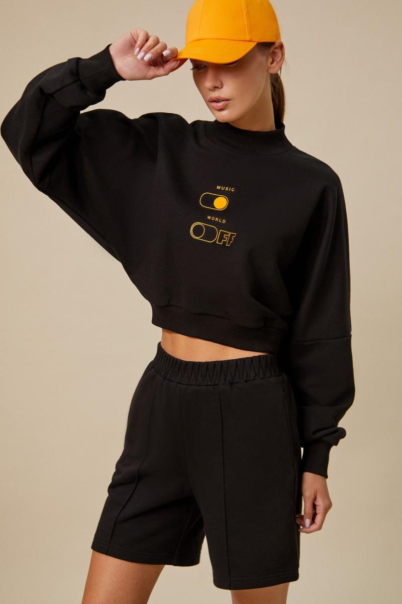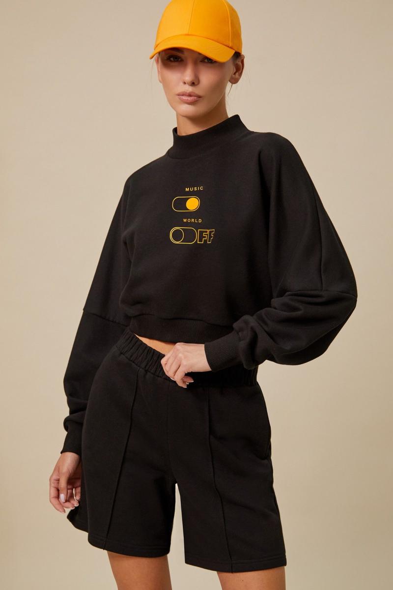 Свитшот: - свободный силуэт - рукав цельнокроеный, с отрезной нижней частью - воротник, манжеты, низ свитшота – кашкорсе - по переду принт.