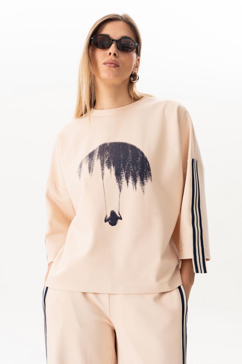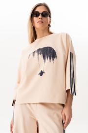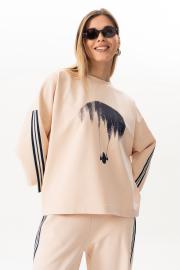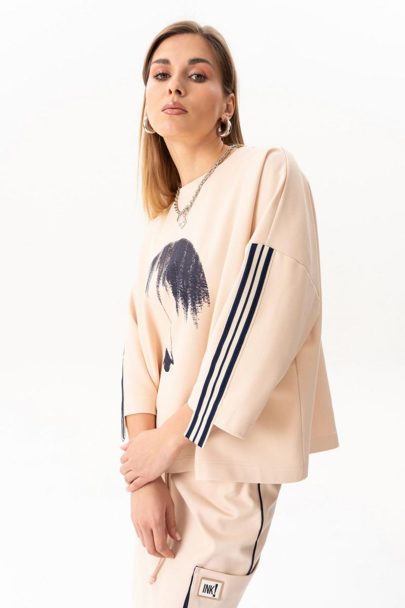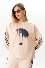 Свитшот прямого силуэта с фигурным низом,округлой горловиной,со спущенной линией плеча,по рукаву декоративная тесьма.По переду свитшота-принт. длина свитшота - 60см