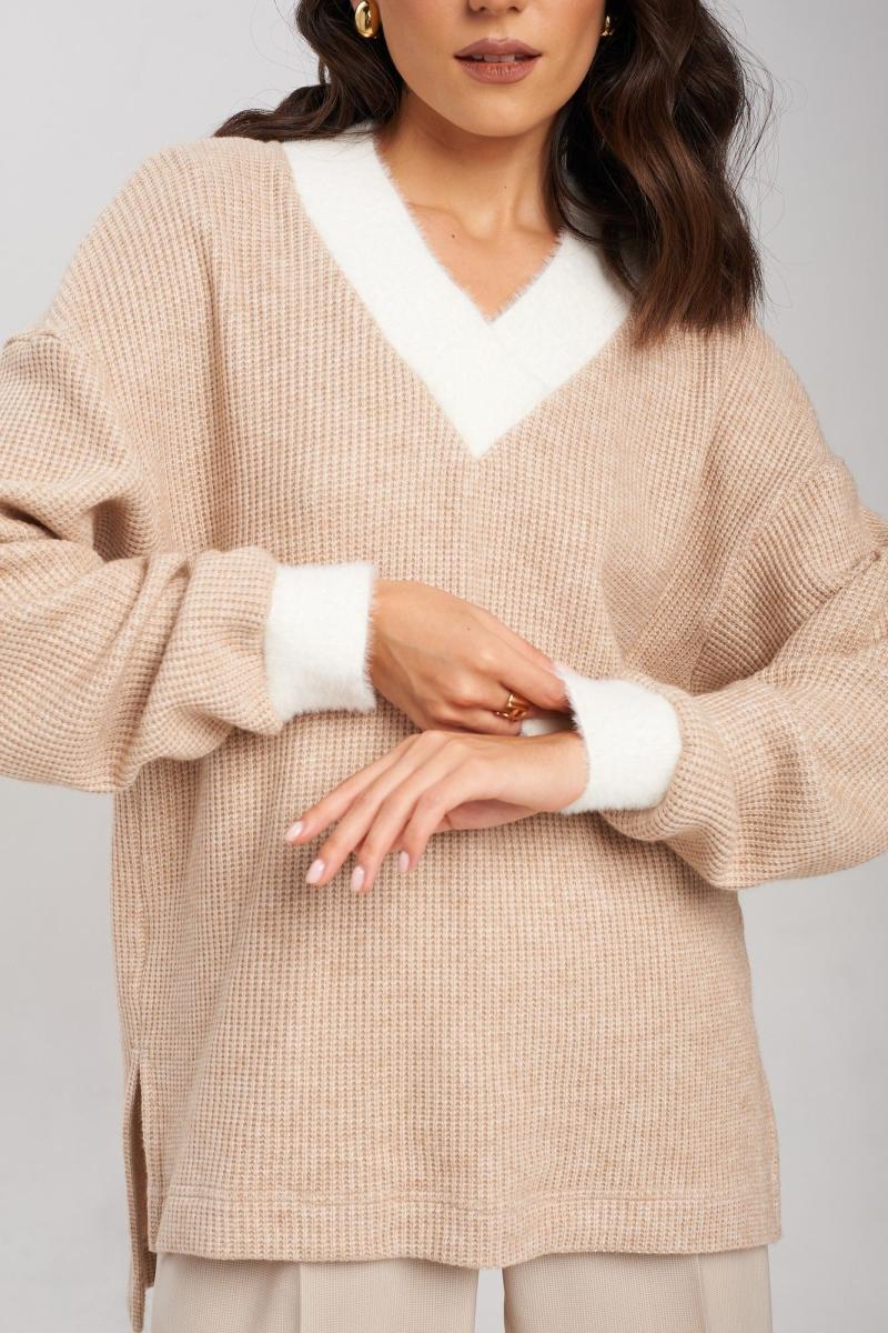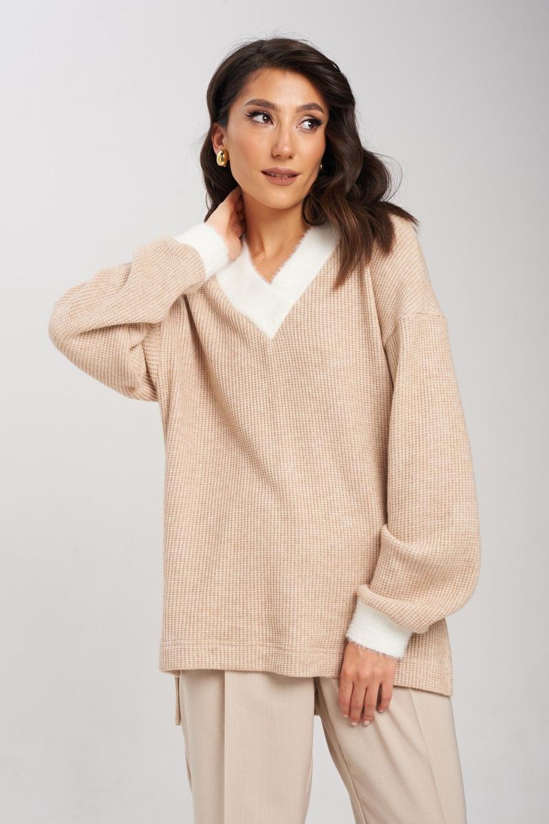 Джемпер свободного силуэта из приятного трикотажного полотна . По горловине и низу рукава пушистые довязы. НЕ КОЛЕТСЯ. Низ ассиметричный. Длина джемпера 73 см Длина рукава 80 см