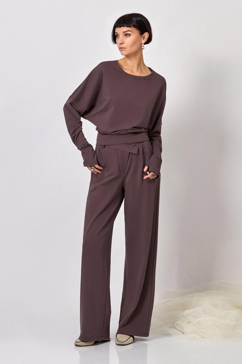 Джемпер с открытой спиной: - О-силуэт - покрой «летучая мышь» - сильно спущена линия плеча - круглый широкий вырез горловины - рукав удлинённый с вырезом для большого пальца - на спинке высокий и широкий вырез, открывающий всю спину - по низу широкий притачной пояс с посадкой чуть ниже талии
