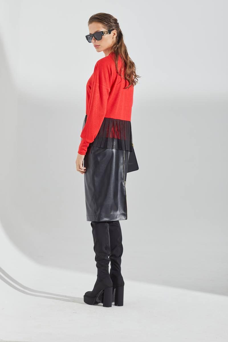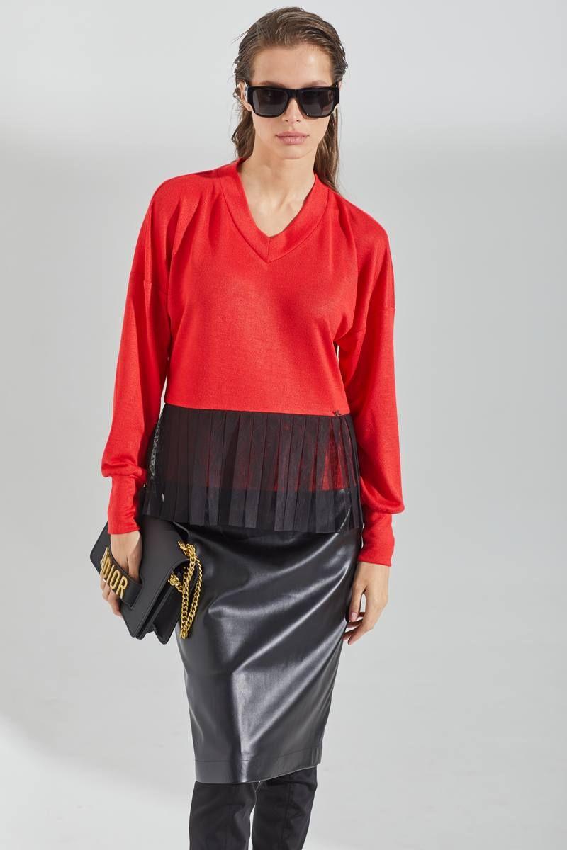 Джемпер трикотажный свободного кроя. Вырез горловины V-образный. По линии талии вставлена отделка из сетки. Рукава длинные с манжетой по низу. Длина джемпера выше линии бедер. Длина изделия - 88 см. Длина рукава - 46 см. "44 р-р: ОГ - 92 см., ОТ - 82 см., ОБ - 84 см. 46 р-р: ОГ - 96 см., ОТ - 86 см., ОБ - 88 см. 48 р-р: ОГ - 100 см., ОТ - 90 см., ОБ - 92 см. "