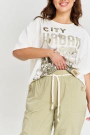 Футболка из вискозного трикотажа, с "холодным" эффектом, свободного силуэта, с коротким рукавом и круглой горловиной. Перед изделия декорирован авторским принтом и нашивками.