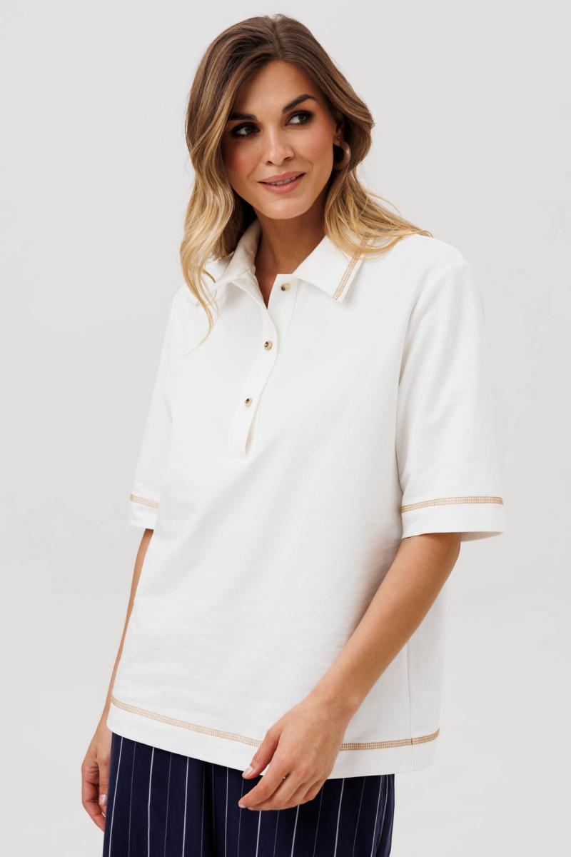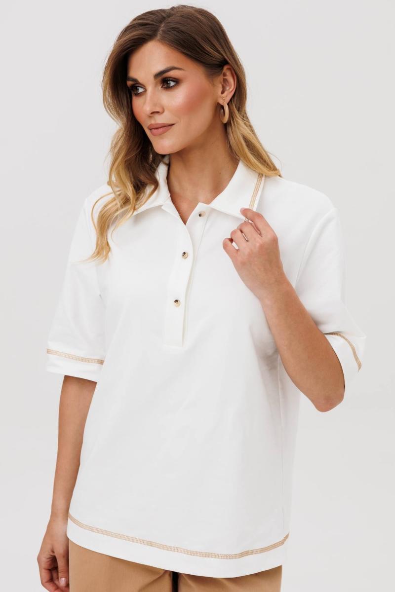 Джемпер прямого силуэта с воротником поло. Рукав втачной одношовный. По низу изделия, по низу рукава и по воротнику проложена отделочная строчка. Длина джемпера- 66 см, длина рукава - 30 см