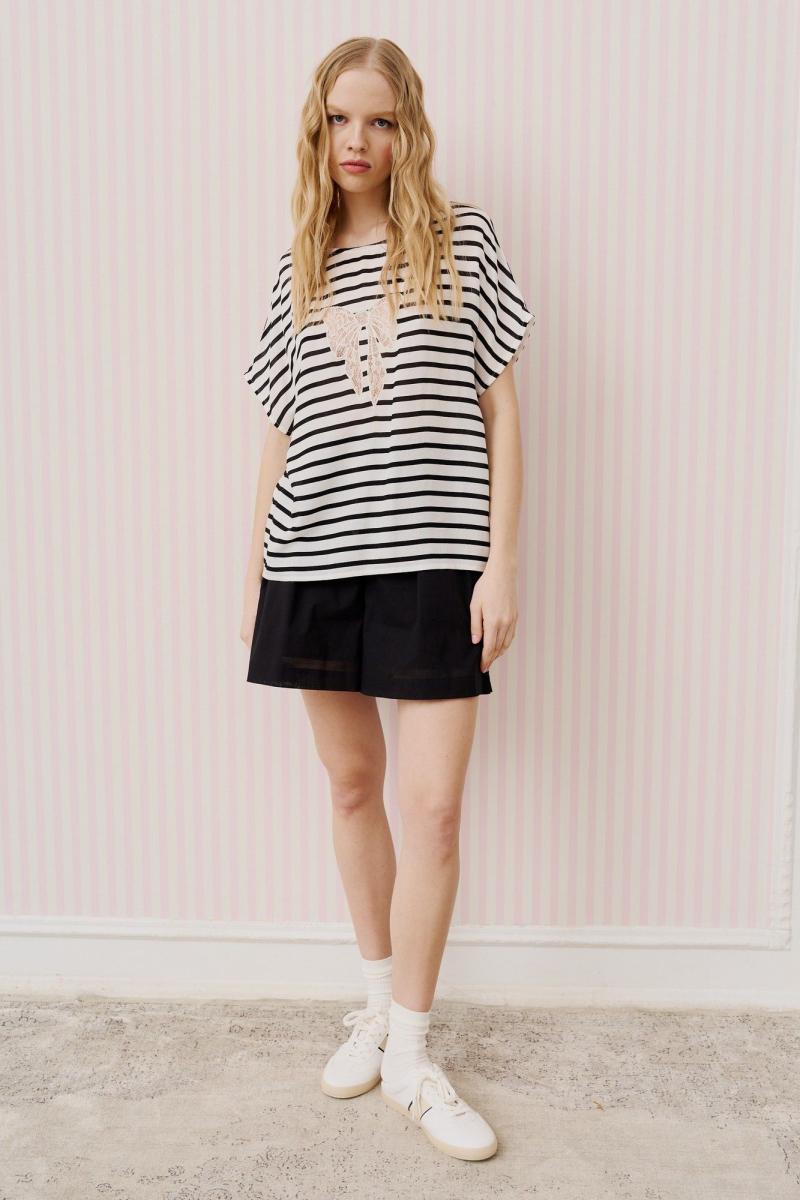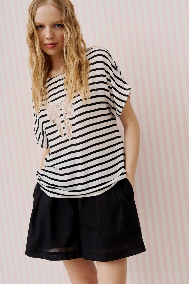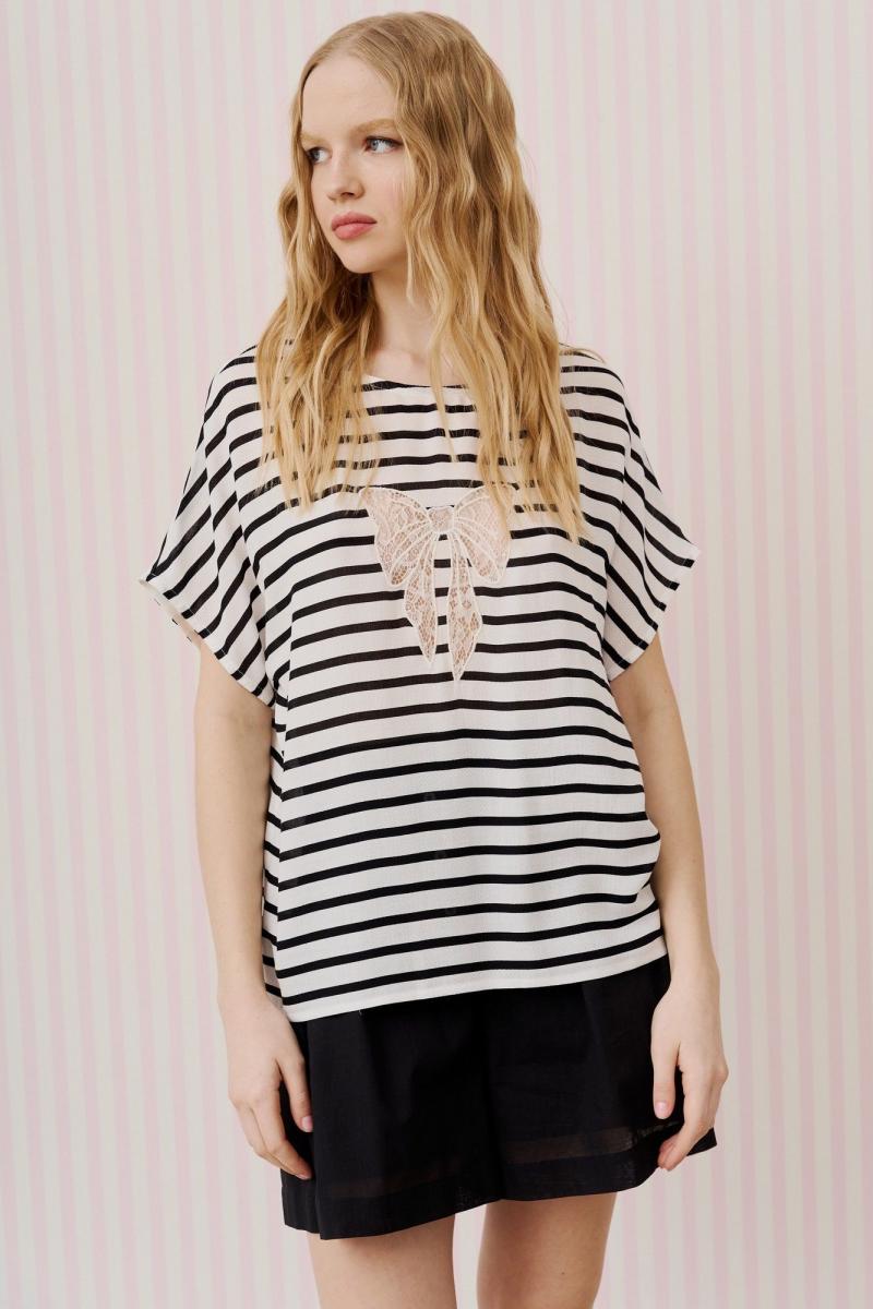Футболка свободного кроя из нежнейшей легкой ткани, дизайн полоска. Рукав спущенный, округлый вырез горловины. По центру вышивка. Внутри вышивки вставлено французское кружево. Футболка: Длина по спинке от верхней точки горловины: 64 см Длина рукава от горловины: 30 см ОГ: 116-120-124-128 см (размер 42-44-46-48)