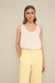 Элегантный топ на широких бретелях, прямого силуэта, выполнен из струящейся ткани с деликатным блеском. Головина и пройма обработаны окантовкой.