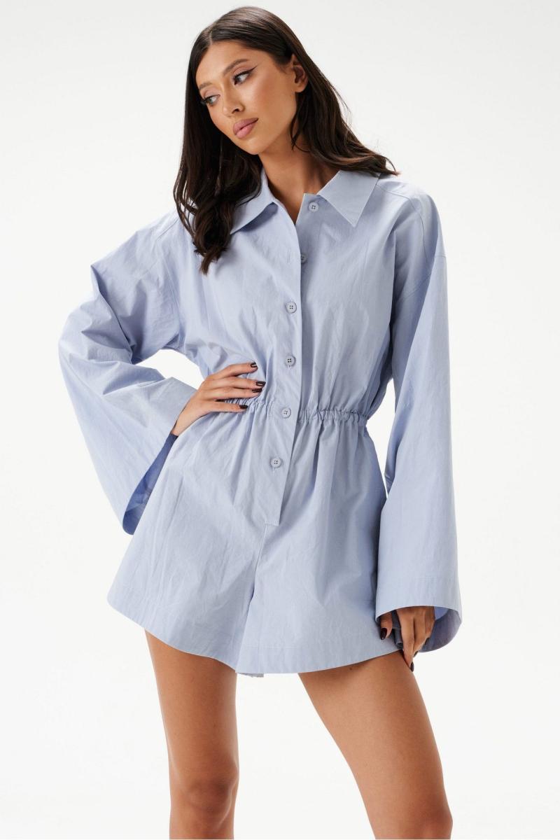 Стильный комбинезон полуприлегающего силуэта выполнен из текстильного полотно полотна небесного цвета.Характеристики: полуприлегающий силуэт, по линии талии вставлена кулиса , присборена на резинку, воротник отложной, застежка центральная на планке на петли пуговички, рукав втачной, расширенный книзу , по низу рукава манжета на пуговичке, шорты в изделии свободного кроя в боковых швах карманы. Длина по спинке 85 см, длина рукава 56 см