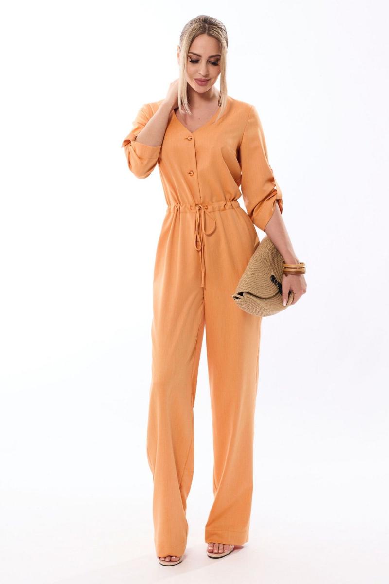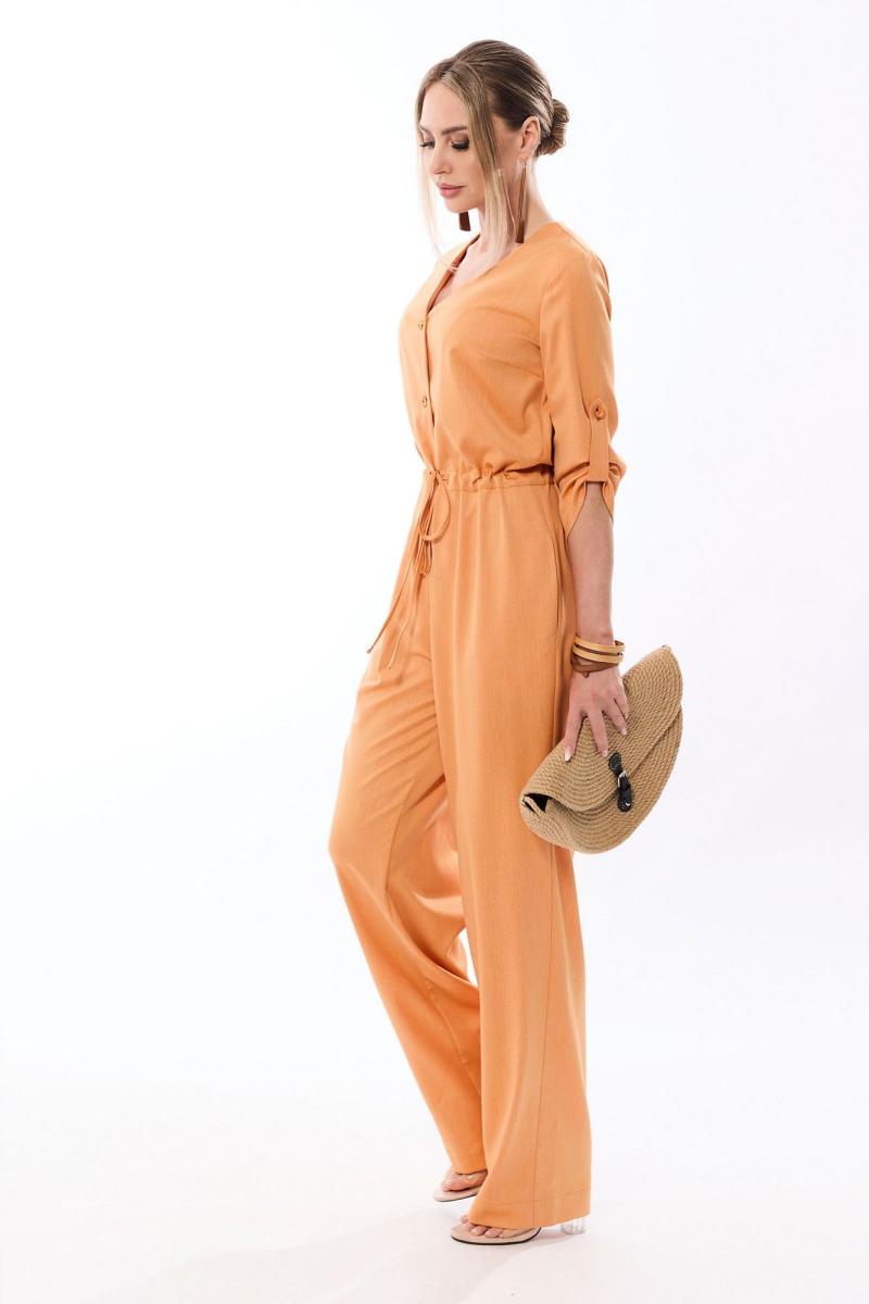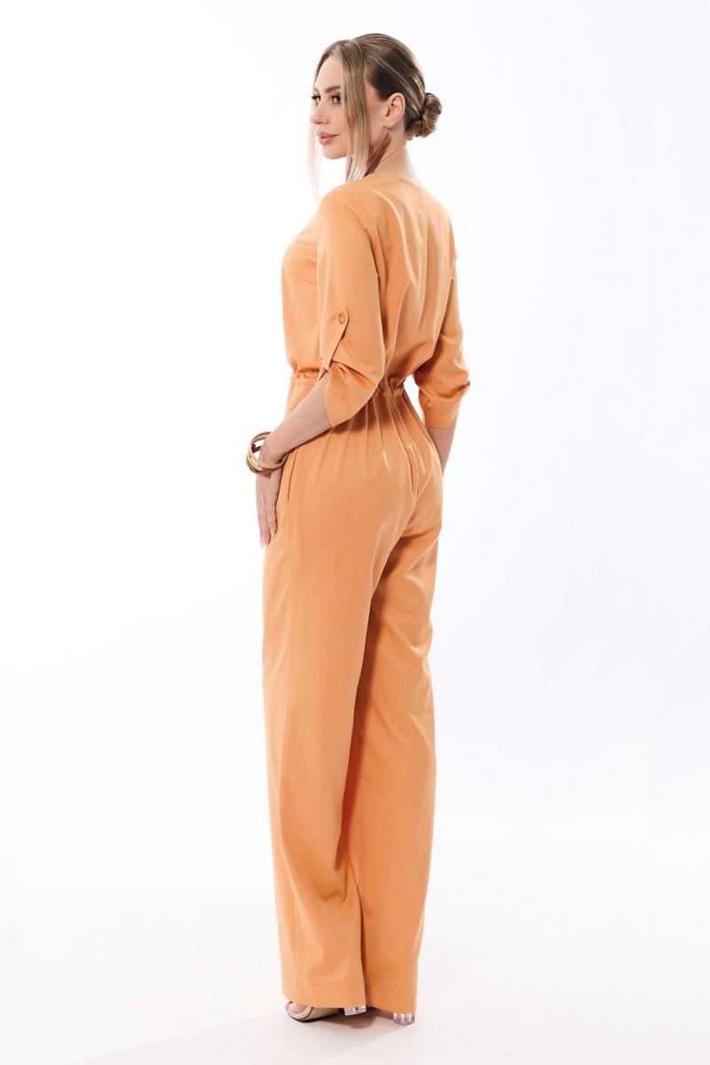 Комбинезон с центральной застежкой на петли и пуговицы, без воротника, с V-образным вырезом горловины. По переду с нагрудными вытачками. Спинка со средним швом. В боковых швах нижней части комбинезона выполнены карманы. На уровне линии талии расположена кулиса со шнуром. Рукав втачной, ¾, с патой, закрепленной к рукаву петлей и пуговицей.