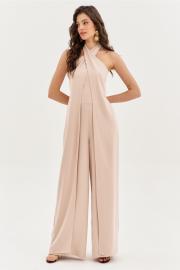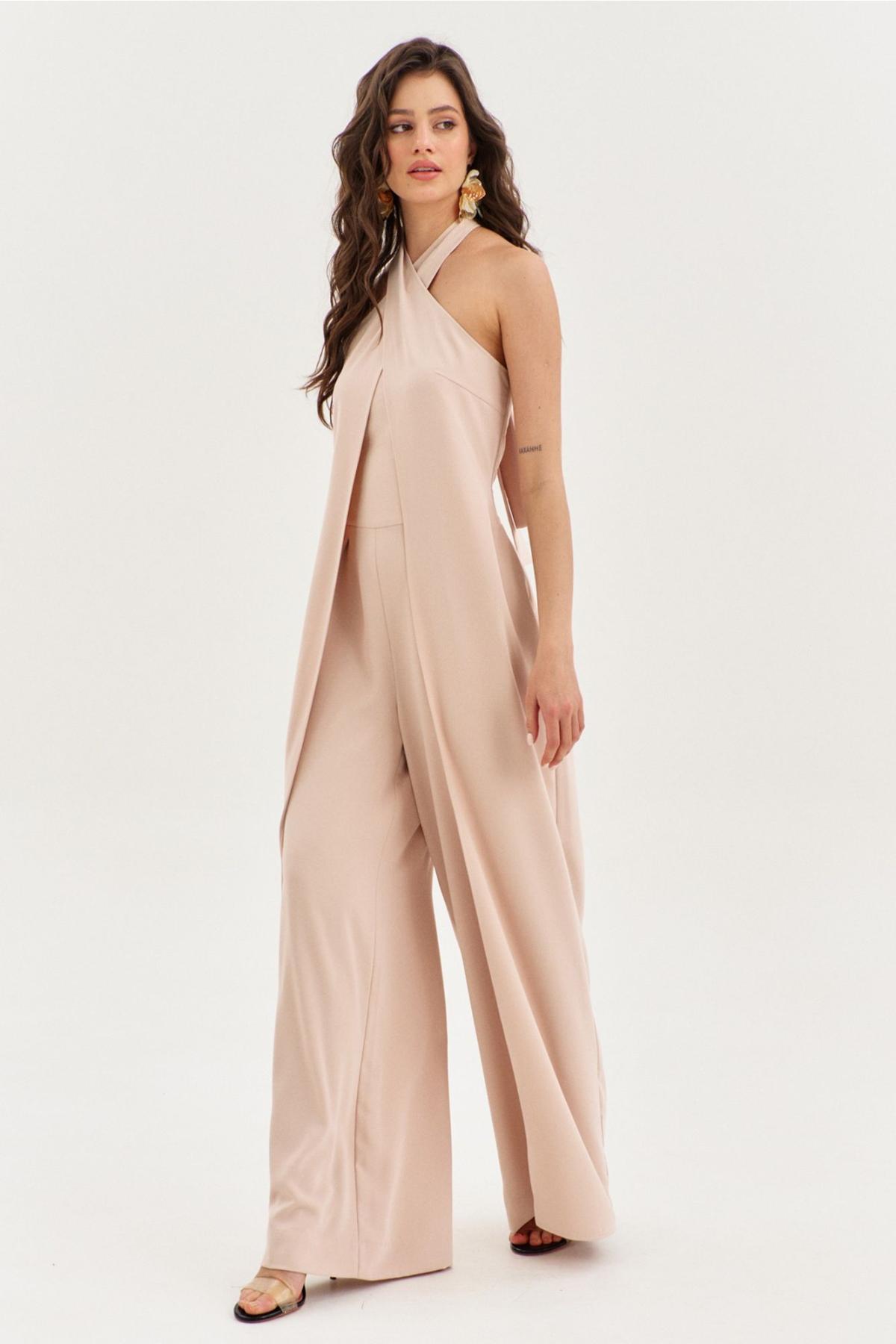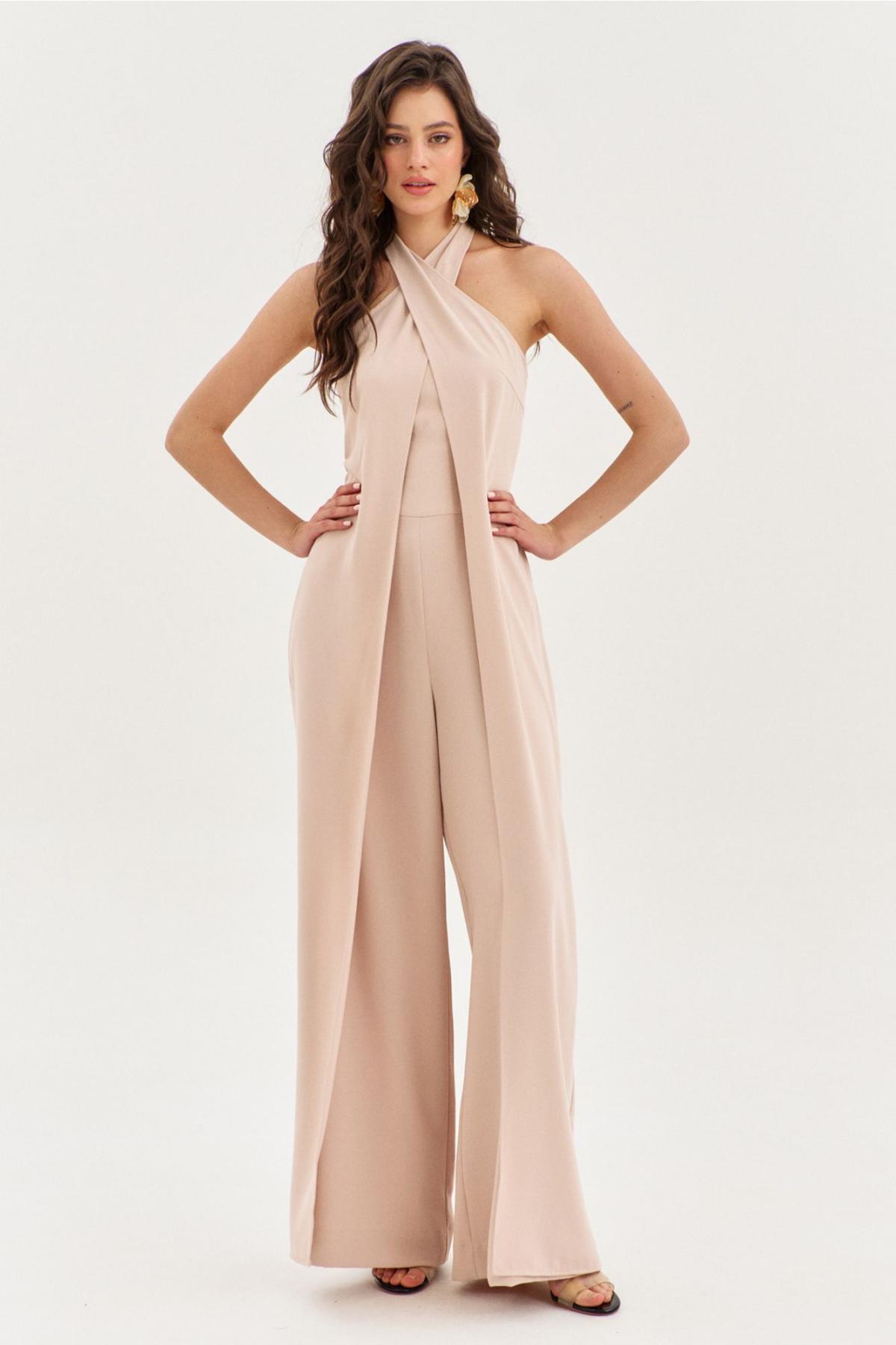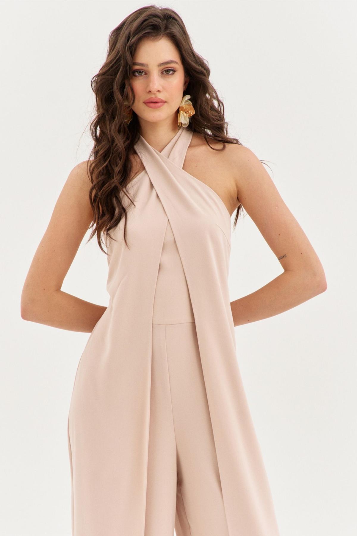 Комбинезон полуприлегающего силуэта. Комбинезон отрезной по линии талии. Лиф переда и спинки с рельефами. В среднем шве спинки вставлена потайная тесьма-«молния». Брюки длинные, широкие. По задним половинам брюк талиевые вытачки. По передним половинам односторонние складки. В боковые швы вставлены отлетные детали, которые переходят в завязки вокруг шей.
