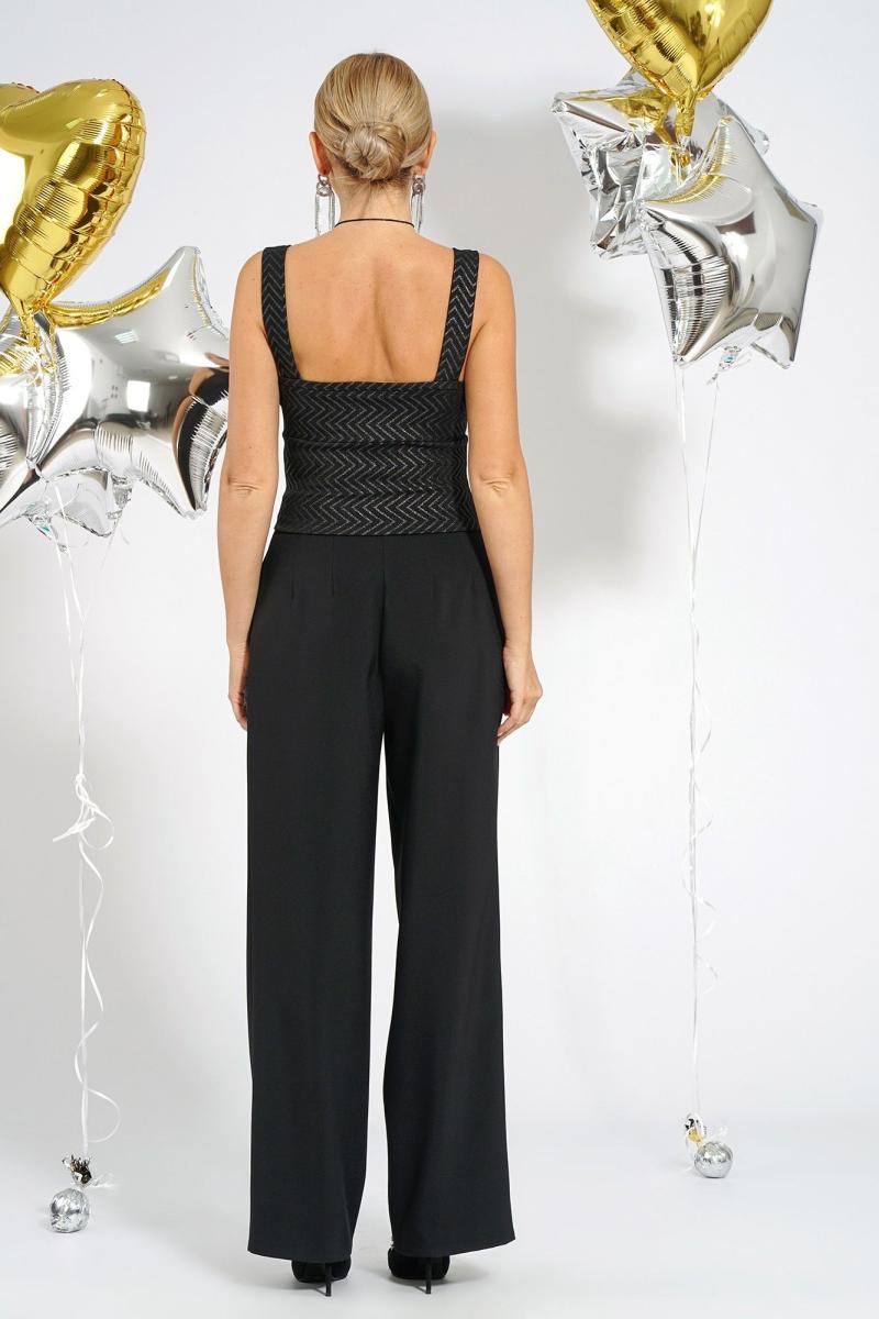 Комплект женский 3-х предметный состоит из жакета, топа и брюк. Жакет прямого силуэта, без застёжки встык. Перед с нагрудными выточками. Спинка со средним швом. Рукава втачные, двухшовные, длиной ¾. Топ полуприлегающего силуэта, на широких бретелях, отрезной ниже линии груди, перед с фигурным верхним краем, с притачной бейкой по верхнему краю переда и спинки. Брюки широкие, свободного прямого силуэта, на притачном поясе, с застёжкой на тесьму-молнию по среднему шву переда и на петлю и пуговицу по поясу. Передние части с талевой выточкой и косыми боковыми карманами. Задние части с четырьмя талевыми выточками разной длины.