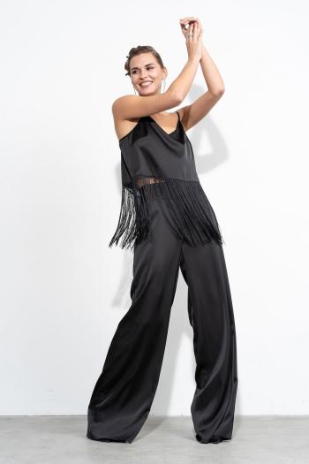 Этот эффектный брючный комплект идеально подойдет и для офиса и для торжества! Комплект женский 2-х предметный состоит из жакета и брюк. Жакет полуприлегающего силуэта, на подкладке, с ассиметричной застёжкой на пробивной люверс и пояс по левой стороне переда застёгивающийся на две петли и пуговицы, с внутренней застёжкой на петлю и пуговицу. Перед с рельефными швами, по правой части прорезной карман с листочкой. Спинка с рельефными швами и средним швом. Рукава втачные, двухшовные, длинные. Воротник отложной с отворотом. Брюки широкие, свободного прямого силуэта, на притачной поясе. Застёжка на тесьму-молнию в среднем шве переда и петлю, пуговицу по поясу. Передние части с талевой выточкой и косыми боковыми карманами. Задние части с талевыми выточками.