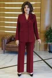 Брюки длинные, типа «клёш» прилегающего силуэта по бёдрам и от линии колена идут на расширение, со сгибом, на притачном поясе, застежка типа «гульфик» на тесьму-молнию, петлю и пуговицу по поясу. Задние части с талевыми выточками.