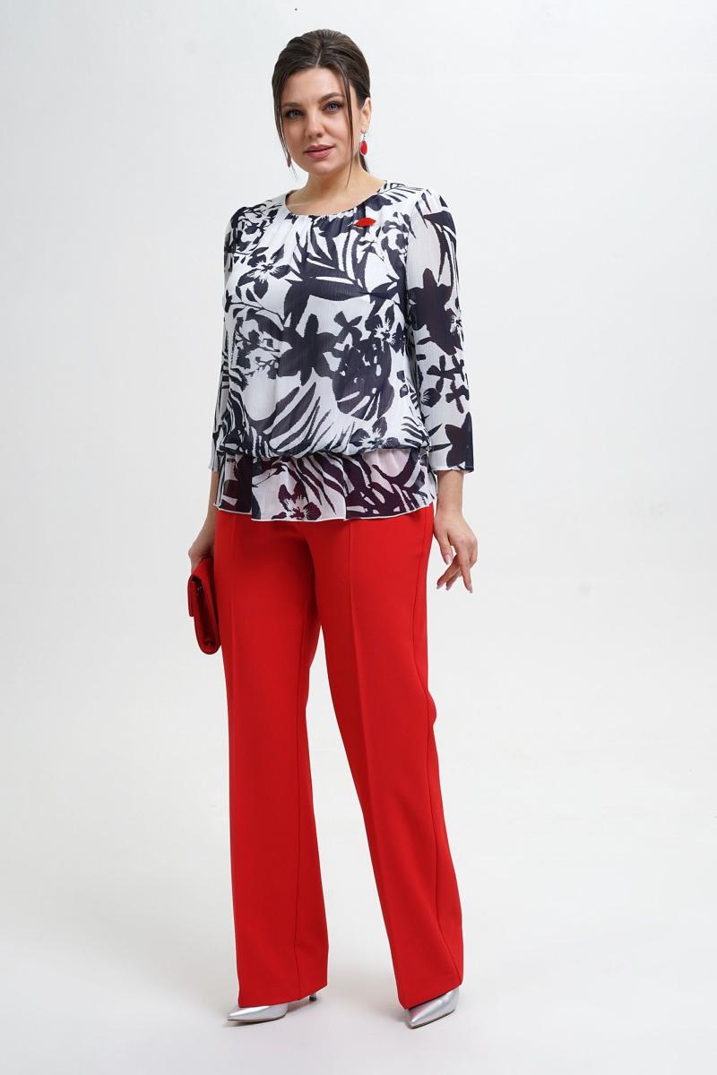 Блуза прямого силуэта, на подкладке, понизу с притачной оборкой по шву соединения со сборкой, с небольшим напуском, степень прилегания фиксирует резинка, с разрезом по среднему шву спинки и с застёжкой на одну навесную петлю и пуговицу. Перед с нагрудными выточками. Спинка со средним швом. Рукава втачные, одношовные, длиной 3/4, по окату со сборкой. Горловина по центру переда со сборкой.