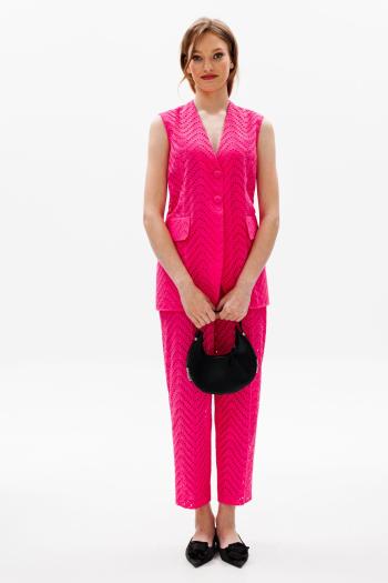 Жакет женский полуприлегающего силуэта, с двух-бортной застёжкой на петли, пуговицу и с внутренней застёжкой на потайную петлю и пуговицу. Перед с отложными лацканами, с рельефными швами. Спинка со средним швом и рельефными швами. Рукава втачные, одношовные, короткие. Воротник отложной с отворотом. Брюки женские полуприлегающие по бёдрам и талии, книзу расширенные, на притачном поясе, застёжка типа «гульфик» и петлю, пуговицу по поясу. Передние части с мягкой застроченной складкой от линии талии и чуть ниже линии бёдер. Задние части с талевыми выточками.