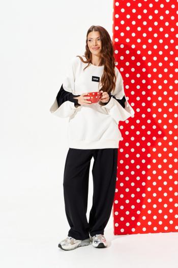 Брюки типа «банан», на притачном поясе на резинке. Передние части с косыми боковыми карманами, по центру от низа конструктивная выточка.