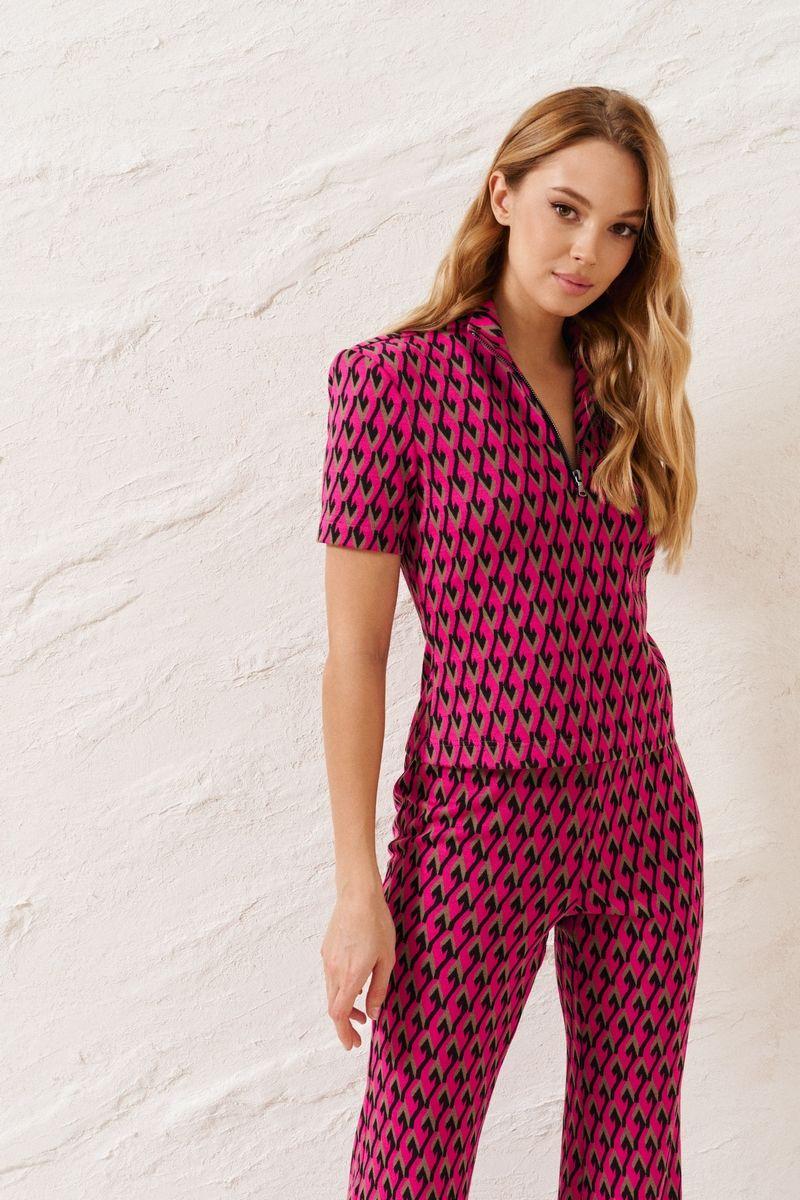 Комплект состоит из джемпера и брюк выполнен из трикотажного полотна с контрастным принтом.Характеристики: джемпер прилегающий силуэт, подплечники, рукав втачной короткий, горловина стойка, застежка по переду изделия - металлическая молния. Длина изделия 51 см, длина рукава 21 см. Брюки прилегающего силуэта, пояс брюк на резинке. Длина брюк 118 см.
