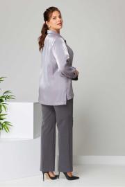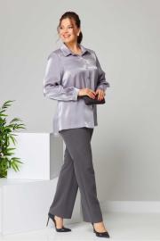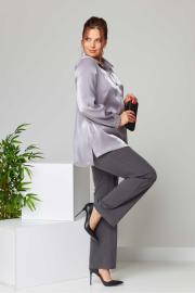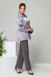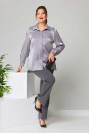 Костюм женский свободного силуэта из костюмной ткани. Рубашка с длинным рукавом и манжетами. воротник мужской на стойке. Перед с нагрудными вытачками и центральной застежкой на пуговицы. Спинка свободная. Брюки классические со стрелками, на поясе с резинкой сзади. Застежка спереди на тесьму-молнию на гульфик. Вырез горловины мужской воротник Длина изделия блузка: 75,0(±1) см. брюки: 107 (±2) см. Длина рукава 61 (±1) см. Вид застёжки блузка: планка по переду брюки: на гульфик на тесьму-молнию. Объём груди размер 50 – 110 (±2) см. размер 52 – 114 (±2) см. размер 54 – 118 (±2) см. Объём талии блузка: размер 50 – 108 (±2) см. размер 52 – 112 (±2) см. размер 54 – 116 (±2) см. брюки: размер 50 – 77 (±2) см. размер 52 – 81 (±2) см. размер 54 – 85 (±2) см. Объём бёдер брюки: размер 50 – 106(±2) см. размер 52 – 110(±2) см. размер 54 – 114 (±2) см. Ширина рукава под проймой размер 50 – 19 (±1) см. размер 52 – 20 (±1) см. размер 54 – 21 (±1) см.