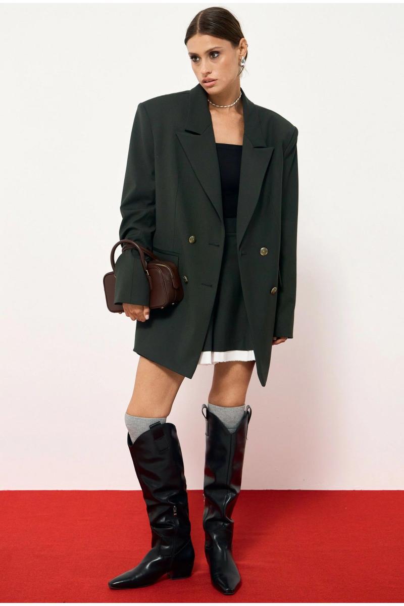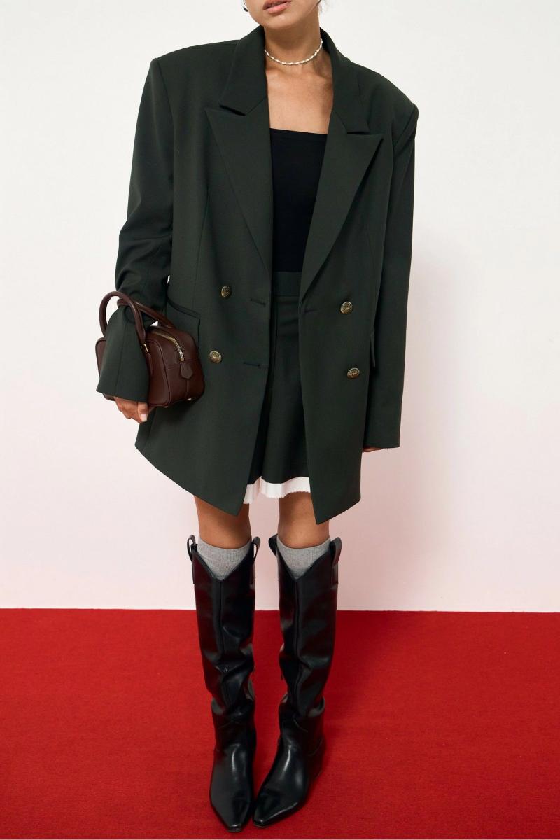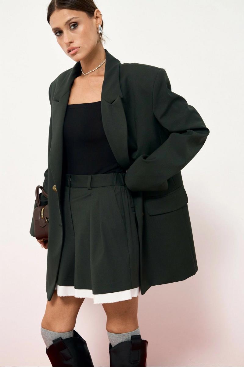 Жакет из костюмной ткани, прямого свободного силуэта. Жакет двубортный, с декоративными пуговицами, по бокам функциональные карманы. Линия плеча слегка увеличена, с подплечниками, рукав втачной. Жакет на подкладке. Шорты прямого кроя, по переду складки, переходящие в стрелки, по бокам функциональные карманы, по низу съемная декоративная оборка. Длина жакета по спинке:76 см. Длина шорт по боковому шву с учетом пояса 42 см.