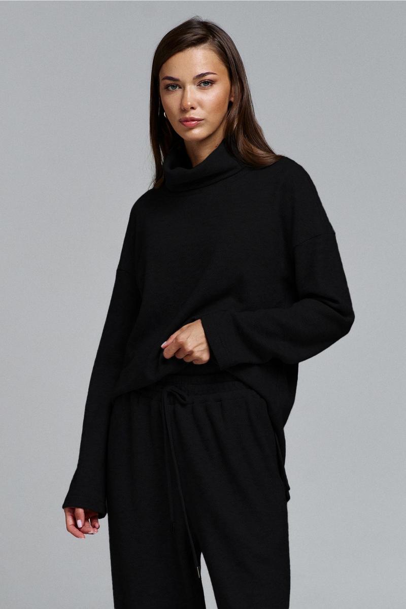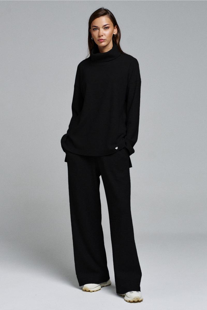 Костюм состоит из джемпера и брюк. Джемпер прямого силуэта со спущенной линией плеча. Рукав втачной. По переду пришито сердце с гравировкой "BUTER". Спинка длиннее полочки, внизу по боковым швам обработаны разрезы. Воротник стойка с отворотом. Брюки на притачном, отстроченном поясе с резинкой и втянутым в него декоративным шнуром. Брюки от линии бедра слегка расширены к низу, с карманами в боковых швах.
