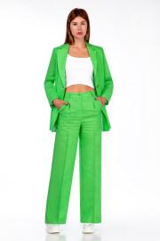 Костюм женский двухпредметный , прямого силуэта. Выполненный из умягченного льна высокого качества . Жакет однобортный , рукав втачной двухшовный со шлицей . Воротник стояче - отложной с отворотами лацканов. По переду жакета также функциональные карманы с клапанами . Жакет на хлопковой подкладке , по спинке жакета высокая шлица . Брюки прямого силуэта , верх брюк обработан притачным поясом. В верхней части брюк расположены карманы .