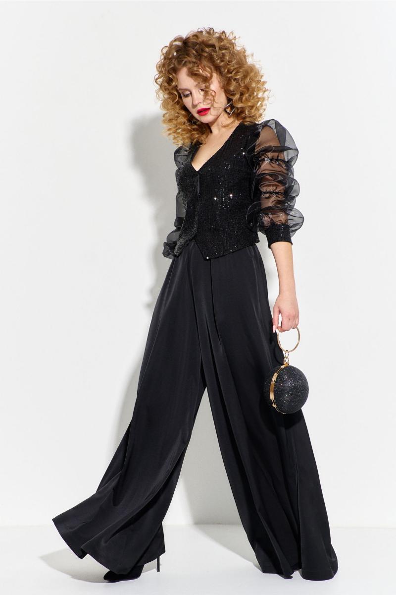 Костюм женский состоящий из блузы и брюк (брюки-юбка). Блуза выполнена из сочетания тканей: трикотажное полотно с пойетками по полочке, рукава и спинка из органзы. Горловина V-образная, рукав втачной, длинный, широкий, с натроченной эластичной тесьмой. Спинка с декоративной вставкой из органзы, застежка потайные кнопки, Полочка блузы с подкладкой. Брюки выполнены из гладкой костюмной ткани расширенные к низу. Брюки с завышенной посадкой на притачном поясе с резинкой, в Боковых швах расположены карманы.